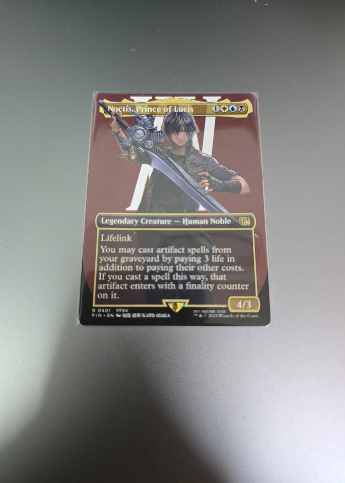 This is a custom-made Magic: The Gathering card named 'Noctis, Prince of Lucis', featuring original art by Kaito Akina. The card appears to be based on characters from the Final Fantasy XV universe and is not an official Wizards of the Coast release. It showcases the set code FFXV and collector number 401. The card has unique text and theme, making it a collectible or novelty item rather than tournament playable. This card is in English and produced with a normal printing treatment.