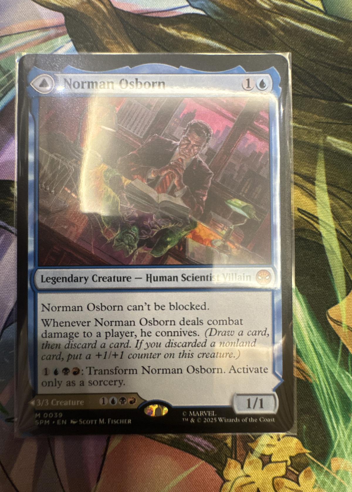 Norman Osborn is a Legendary Creature - Human Scientist Villain from the Magic: The Gathering Marvel set (SPM), card number 39. This card was illustrated by Scott M. Fischer and is printed in English. The card features the unique ability to be unblockable and has a connive mechanic. It is a normal (non-foil) printing. This Marvel crossover card is primarily collectible but may also have playability in casual or thematic Commander formats. Note: Not standard-legal or meta in competitive constructed.