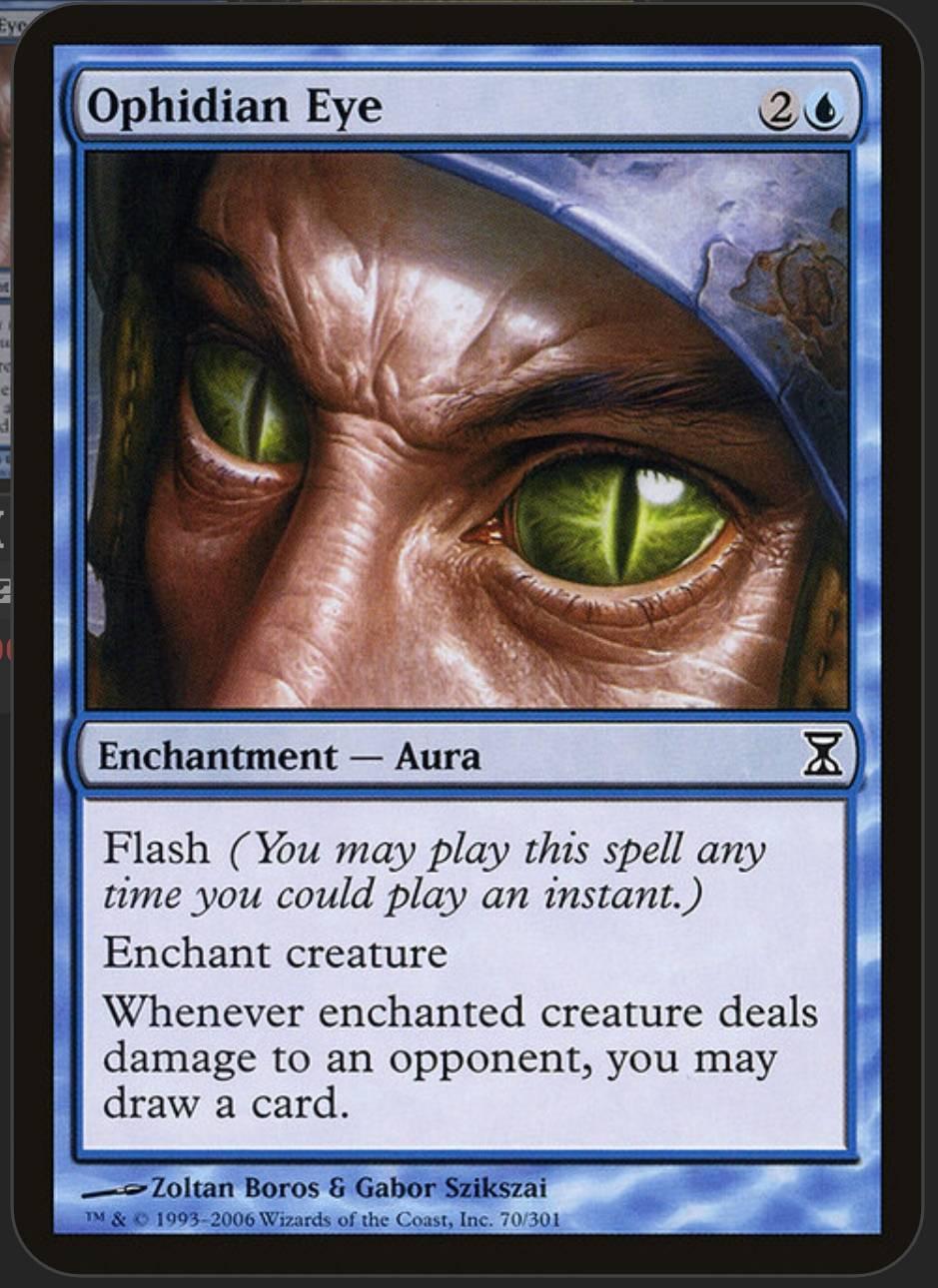 Ophidian Eye is an enchantment aura card from the Time Spiral set. It features art by Zoltan Boros & Gabor Szikszai. This card has the flash ability and allows you to draw a card whenever the enchanted creature deals damage to an opponent. Playable in various Magic: The Gathering decks, it offers card draw advantage. The card is in English and has a normal printing treatment.