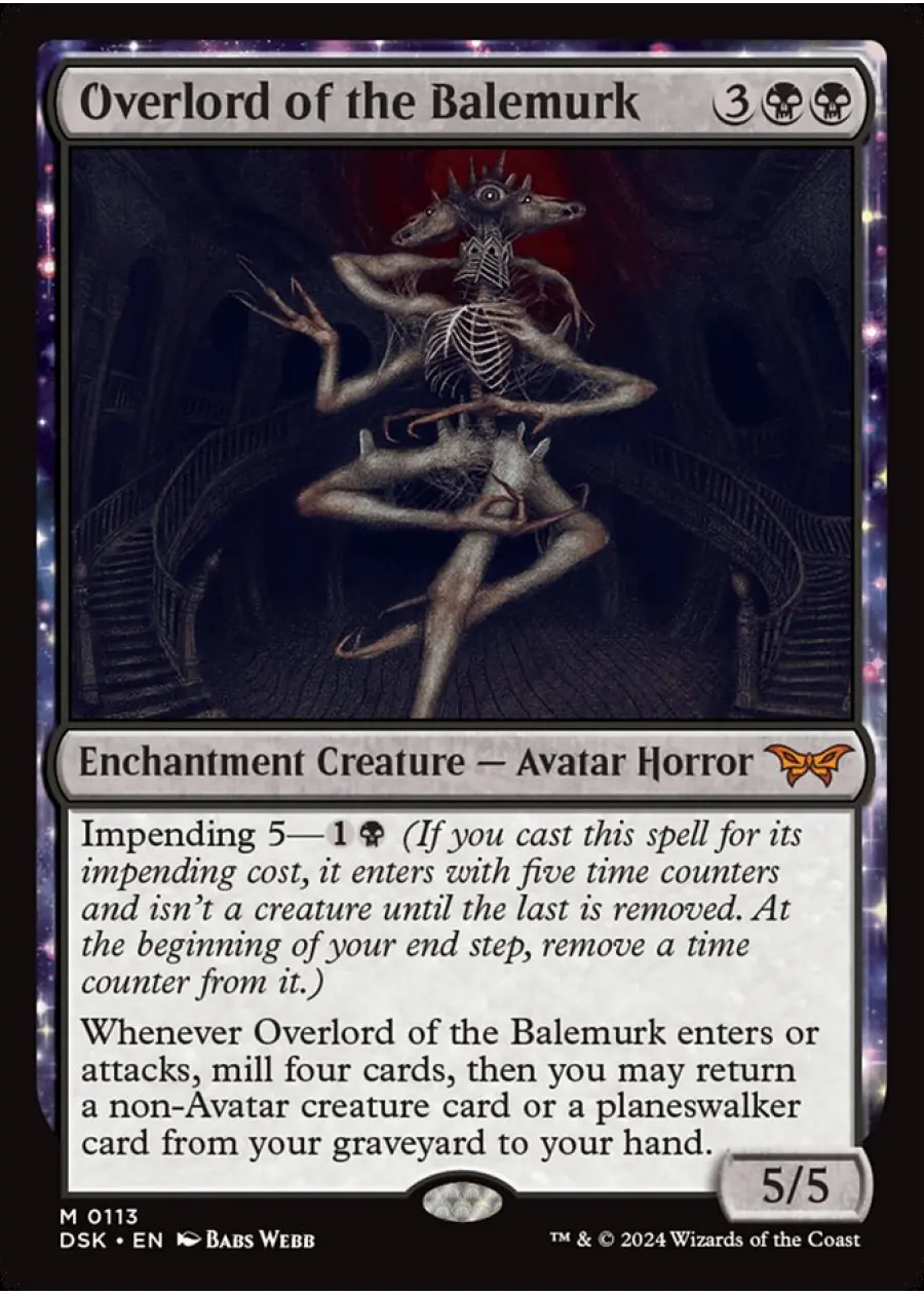 Overlord of the Balemurk is a Mythic Rare enchantment creature from Magic: The Gathering's 'Duskmourn: House of Horror' set, illustrated by Babs Webb. This black Avatar Horror uses the unique Impending mechanic and provides a powerful graveyard recursion ability. This card is primarily collectible due to its unique mechanics and flavor, but could see play in graveyard-based or reanimation Commander decks. The card is in English, set number 113, and features a normal (non-foil) finish.