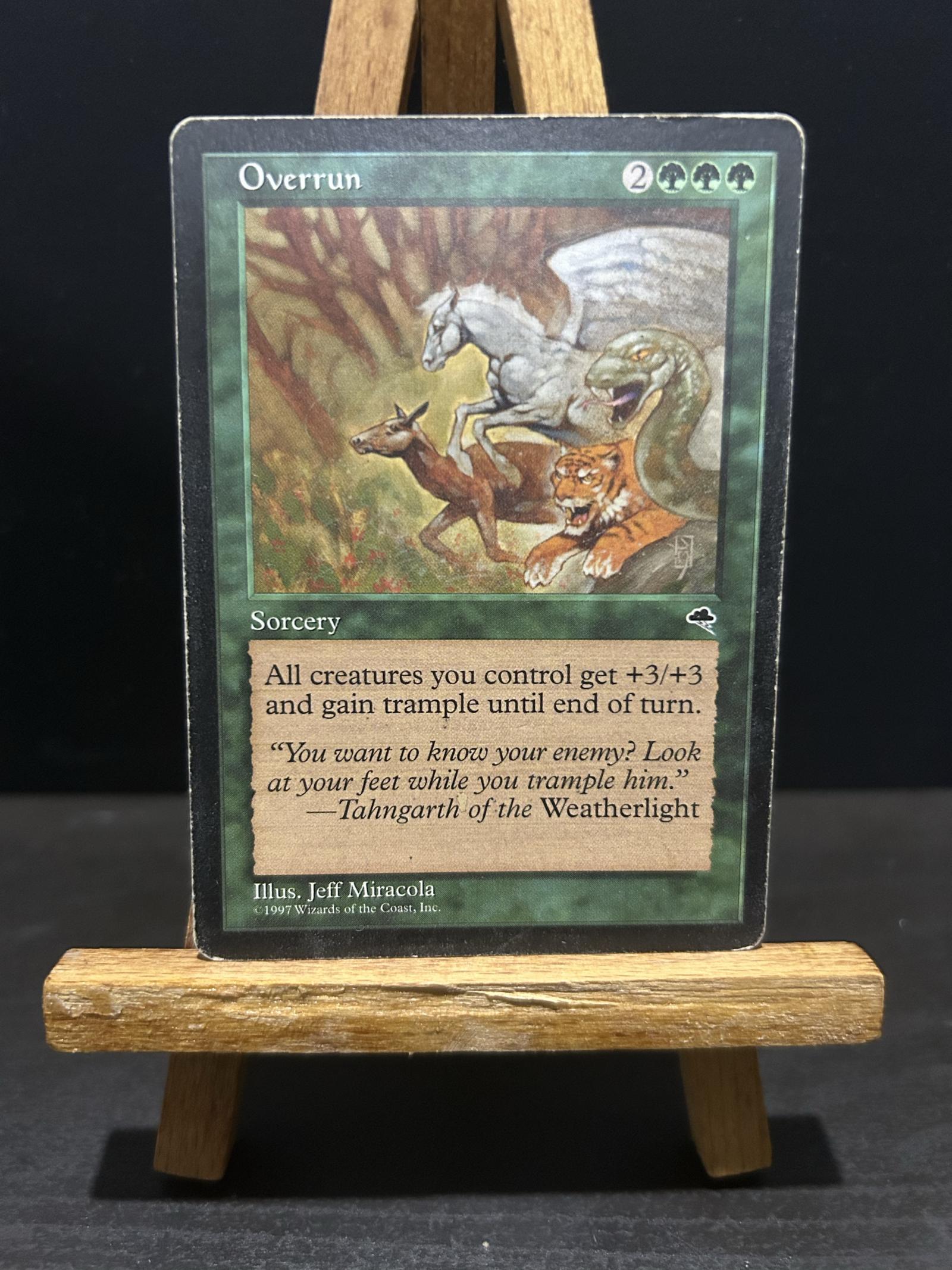 Overrun is a sorcery card from the Alpha set of Magic: The Gathering, illustrated by Jeff Miracola. The card grants all creatures you control +3/+3 and trample until end of turn. This card is collectible and has historical significance as part of the original Magic set. It is not foil and is in normal condition.