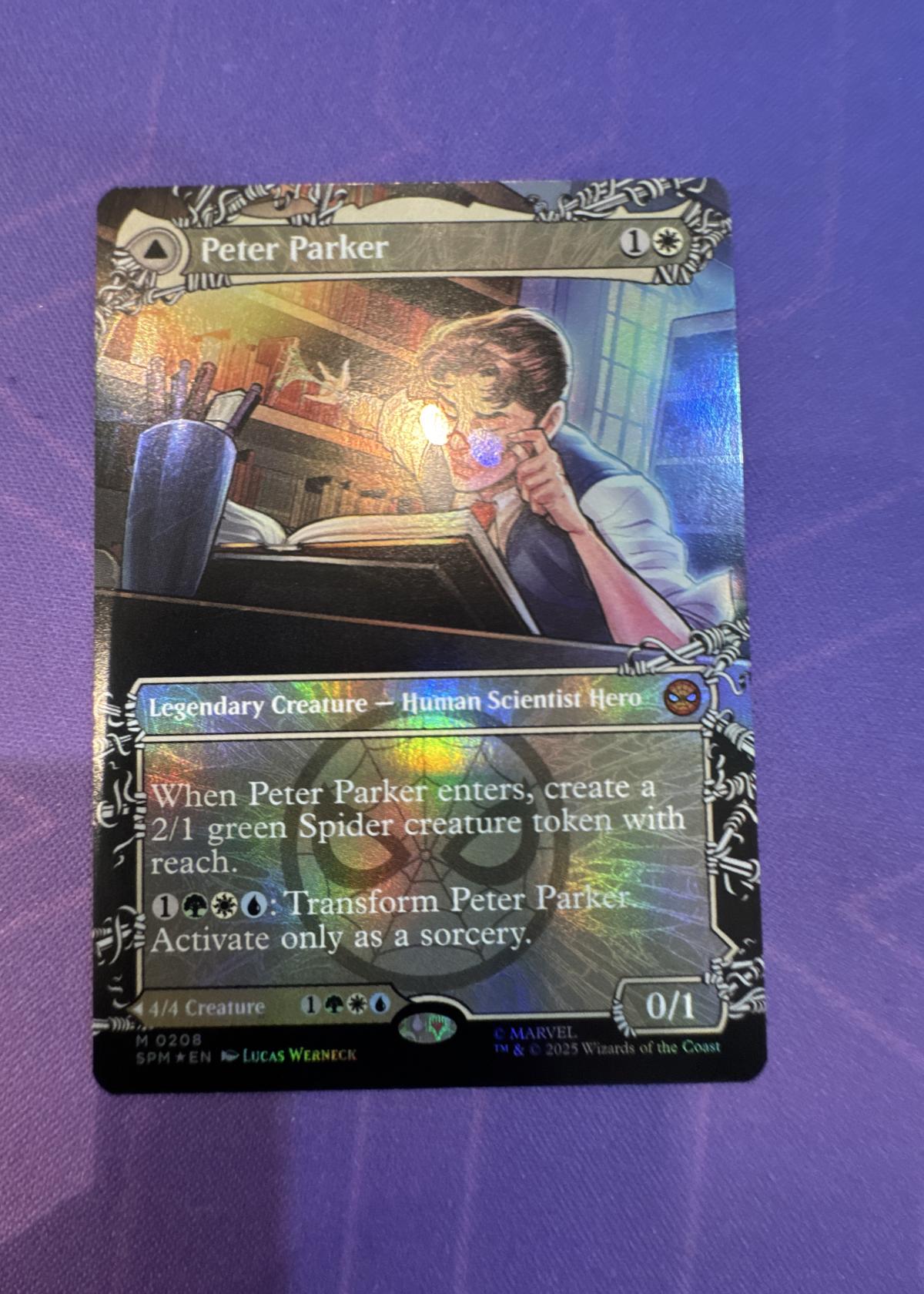 Peter Parker is a legendary creature card from the Magic: The Gathering Universes Beyond: Marvel set. This foil card features art by Lucas Werneck. When it enters the battlefield, it creates a 2/1 green Spider creature token with reach. The card has a transform ability that can be activated as a sorcery. Great for collectors and fans of Marvel crossovers. Notable for its special foil treatment and crossover appeal. Set: Marvel, Card No: 208, Artist: Lucas Werneck.