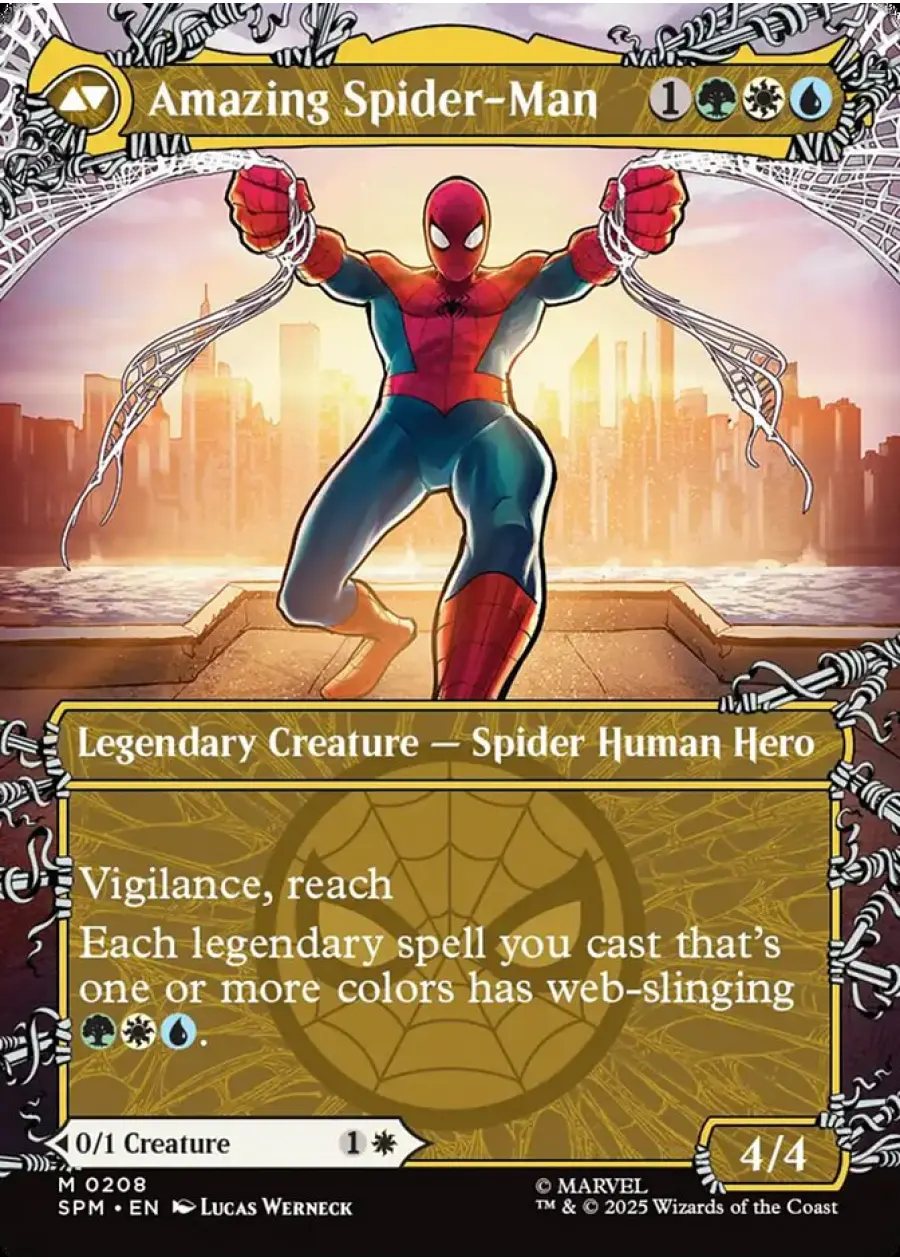 Each legendary spell you cast that's one or more colors has web-slinging. (You may cast a spell for its web-slinging cost if you also return a tapped creature you control to its owner's hand.)