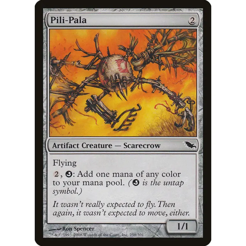 Pili-Pala is a vintage artifact creature card from Magic: The Gathering. Artwork by Ron Spencer. This card is from the set with set code 'SHM'. It is playable in certain combo decks in the meta due to its ability to add mana of any color by untapping. The card is not foil and is in English.