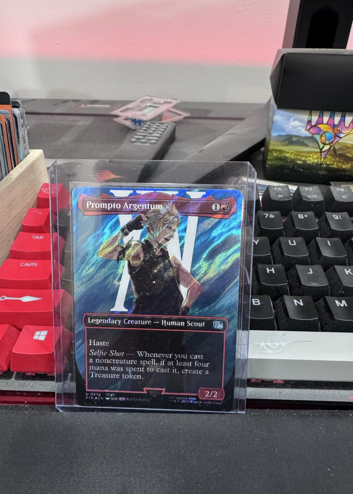 Prompto Argentum has haste and a unique Selfie Shot ability that generates Treasure tokens when casting noncreature spells costing four or more mana, offering valuable resource generation and synergy potential in various decks. While currently ungraded, the card is an interesting collectible for both Magic and Final Fantasy fans, combining iconic character art with playable mechanics. Ideal for collectors or players looking to add flavor and utility to their decks.