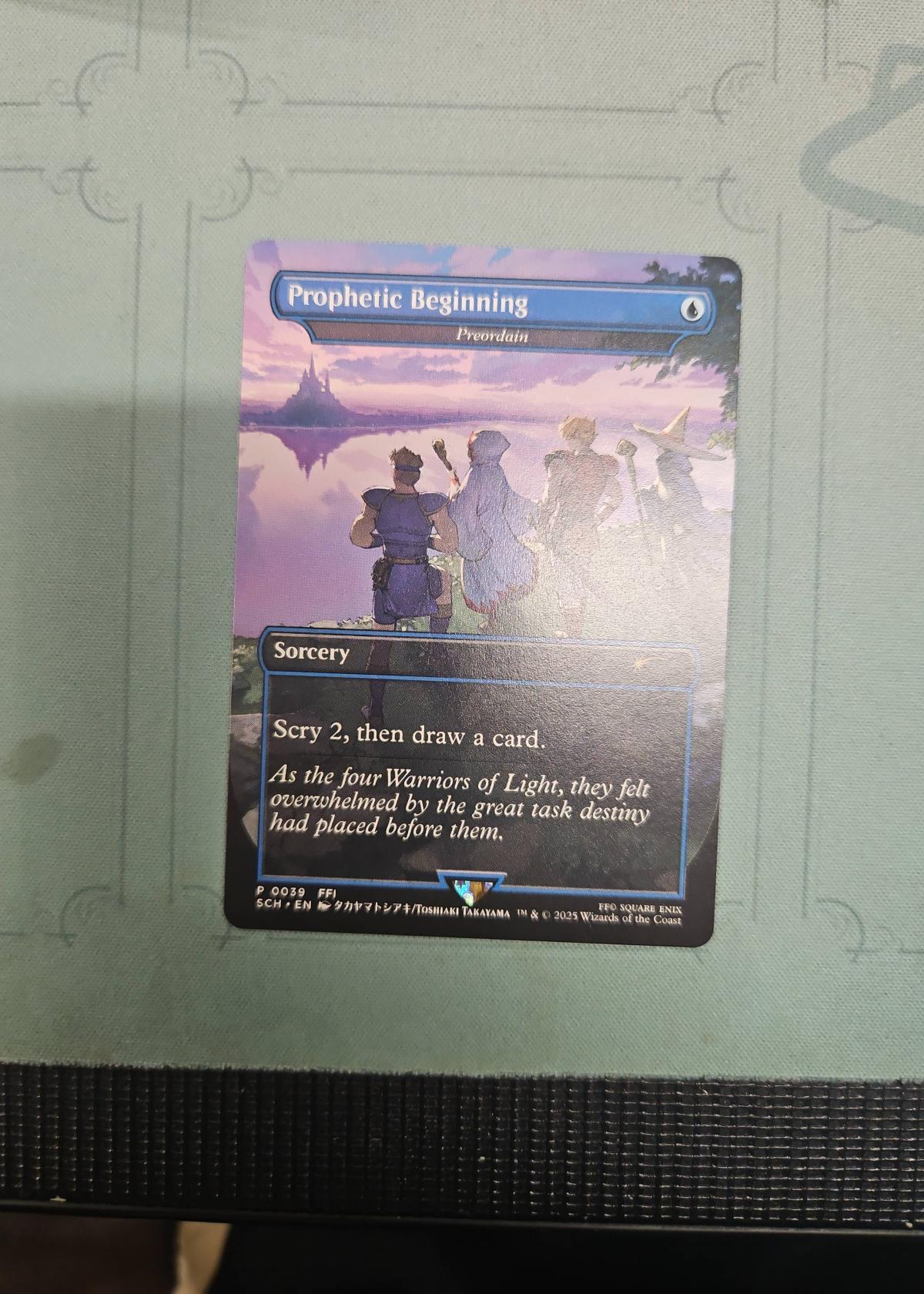 Prophetic Beginning is a special Magic: The Gathering card from the 'Secret Lair x Final Fantasy' set (SCH), with artwork by Toshiyuki Takayama. This card features English language (EN), card number 389, and has a normal (non-foil) printing. It is a reskin of the playable staple 'Preordain,' popular in many constructed formats, making it both highly collectible and potentially playable in meta decks. The card showcases the four Warriors of Light, a Final Fantasy theme, making it unique for collectors and fans of both franchises.