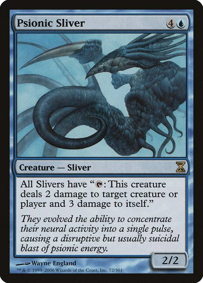 Psionic Sliver from the Time Spiral set, card number 72/301. Illustrated by Wayne England. This creature card is a collectible and playable Sliver card featuring a unique ability that deals damage to a target but also damages itself. The card is in English and is a normal printing.