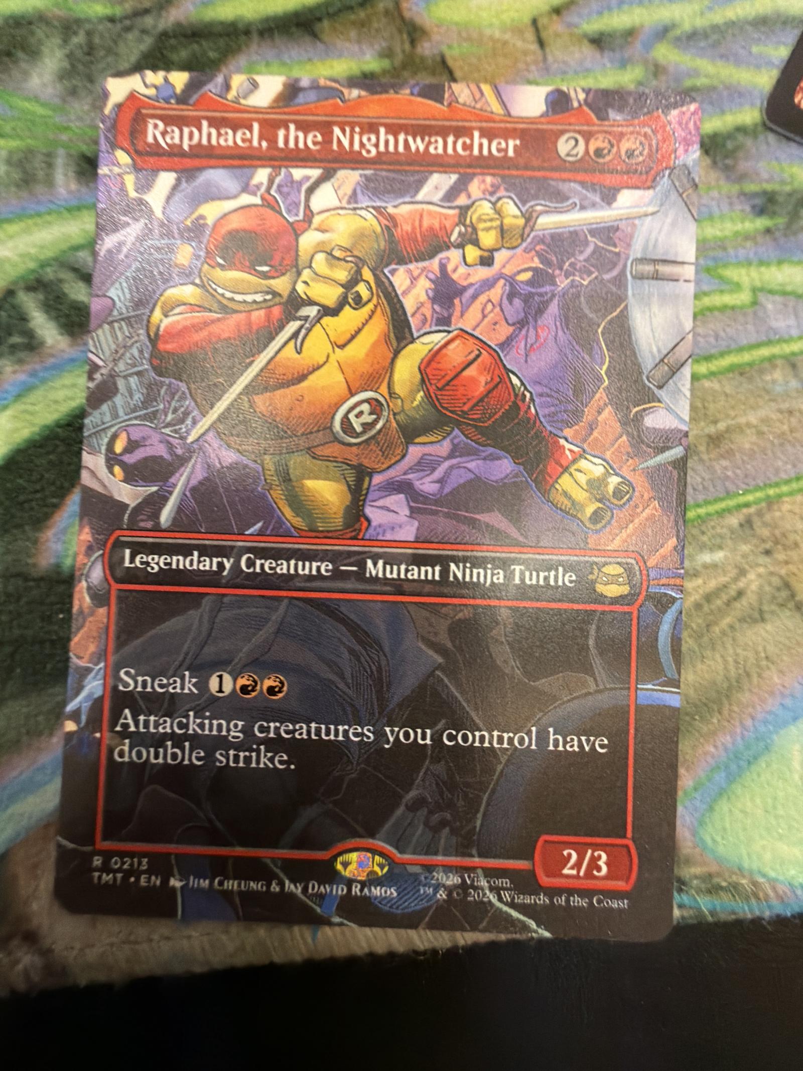Raphael, the Nightwatcher is a Legendary Creature - Mutant Ninja Turtle from the Magic The Gathering set TMNT by Viacom. Artwork by Jim Cheeung & Jay David Ramos. This card grants attacking creatures double strike, making it playable in aggressive and synergistic decks. It is a normal printing.