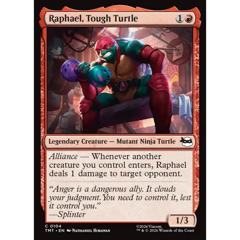 - Alliance — Whenever another creature you control enters, Raphael deals 1 damage to target opponent.