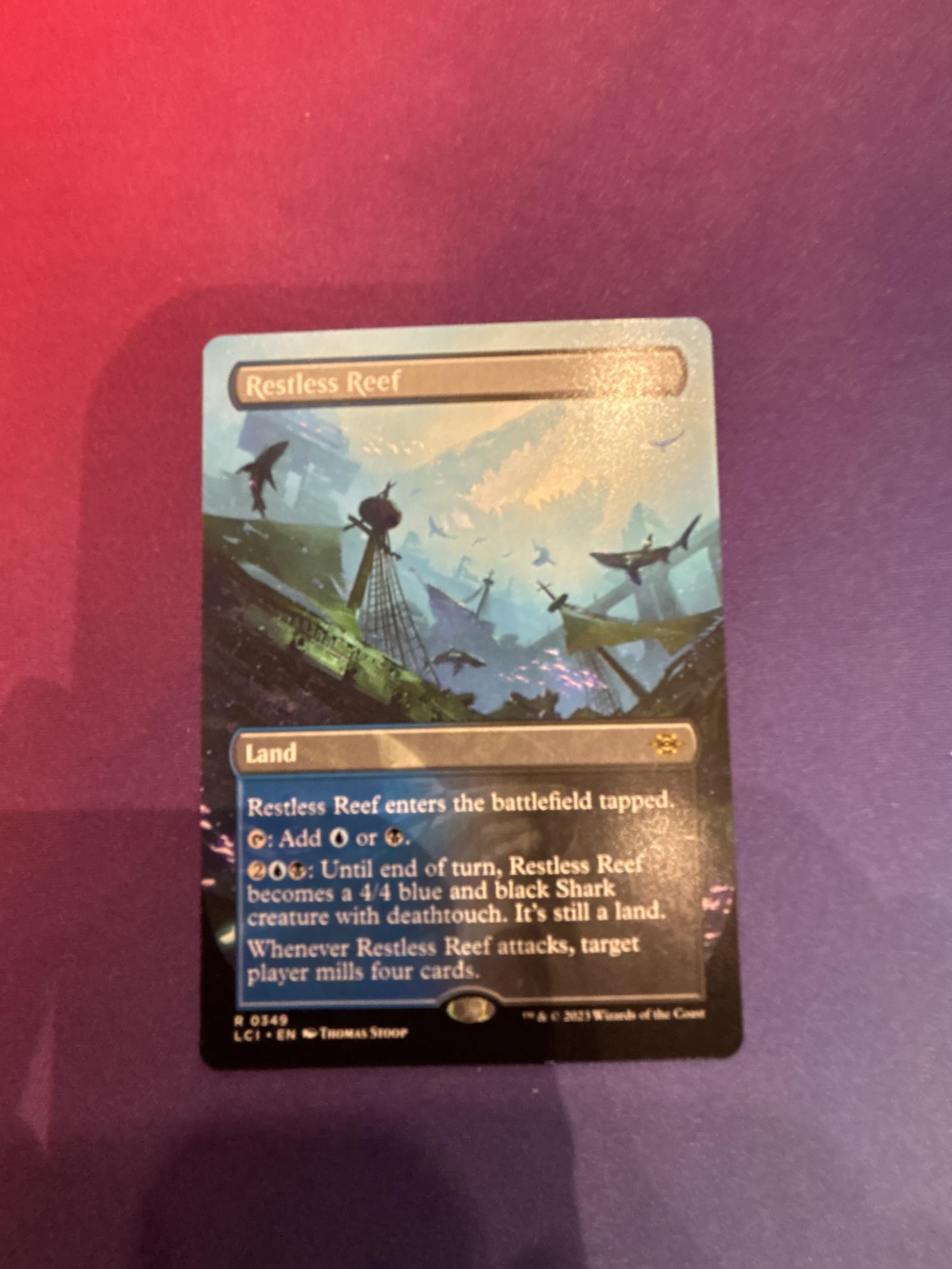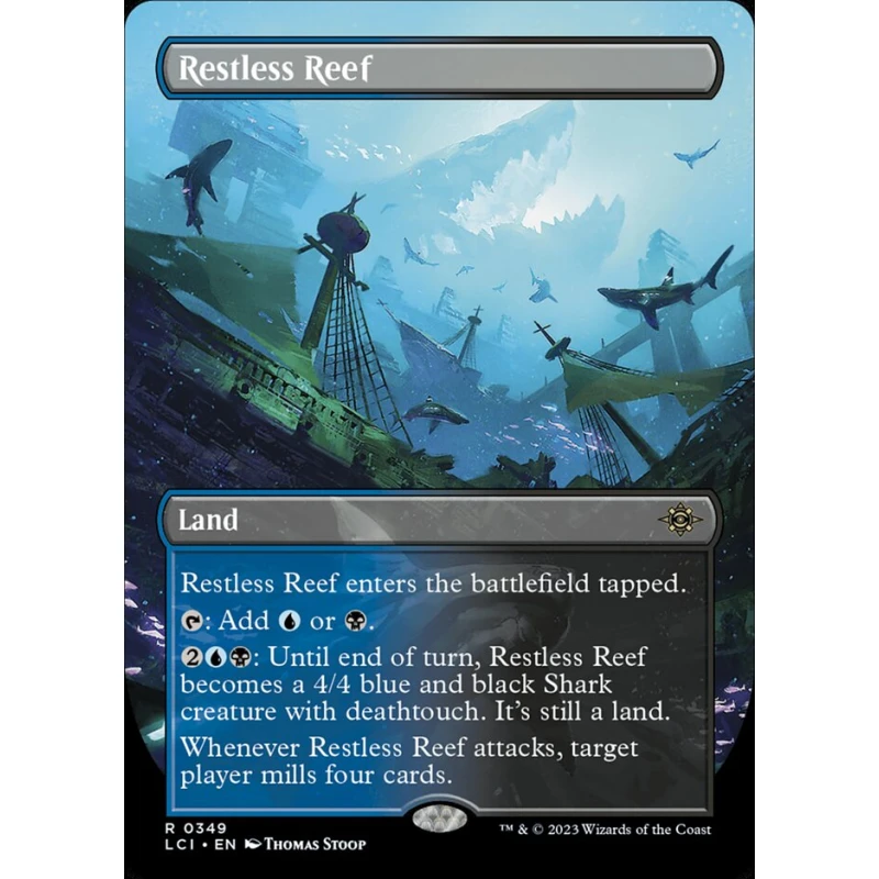 Restless Reef is a Land card from the set 'Laeliana's Crossing' (LCI). The card art is by Thomas Stoop. It enters the battlefield tapped and can produce blue or black mana. For 2UB it becomes a 4/4 blue and black Shark creature with deathtouch until end of turn and mills four cards when it attacks. This card is commonly used in mill or control strategies. The card is non-foil and in English language.