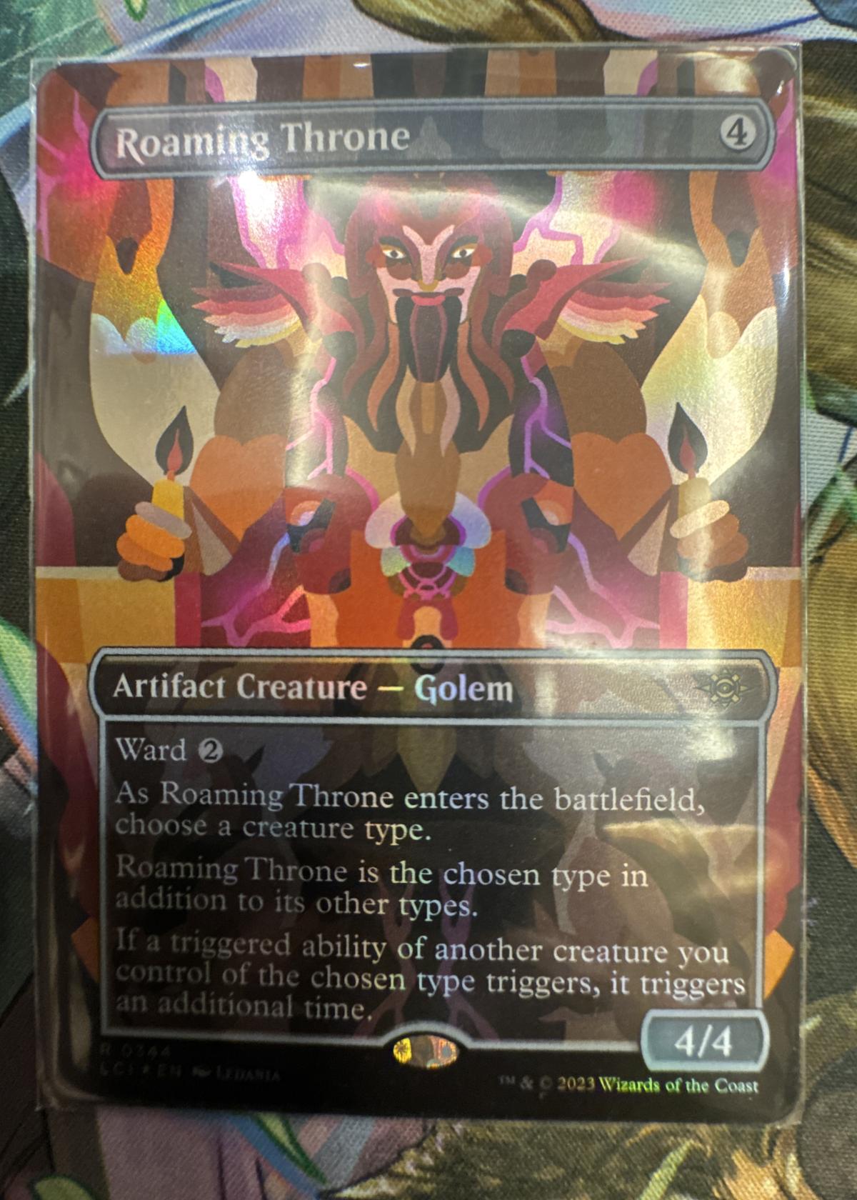 Roaming Throne is an artifact creature — Golem from the Magic: The Gathering set 'Lost Caverns of Ixalan' (LCI), illustrated by Leonian. This is a rare, foil version of the card. The card is known for its utility in tribal decks thanks to its ability to double triggered abilities of creatures of a chosen type, making it playable and occasionally seen in meta decks, particularly in Commander. The card has unique art and a beautiful foil treatment, making it a great collectible as well.