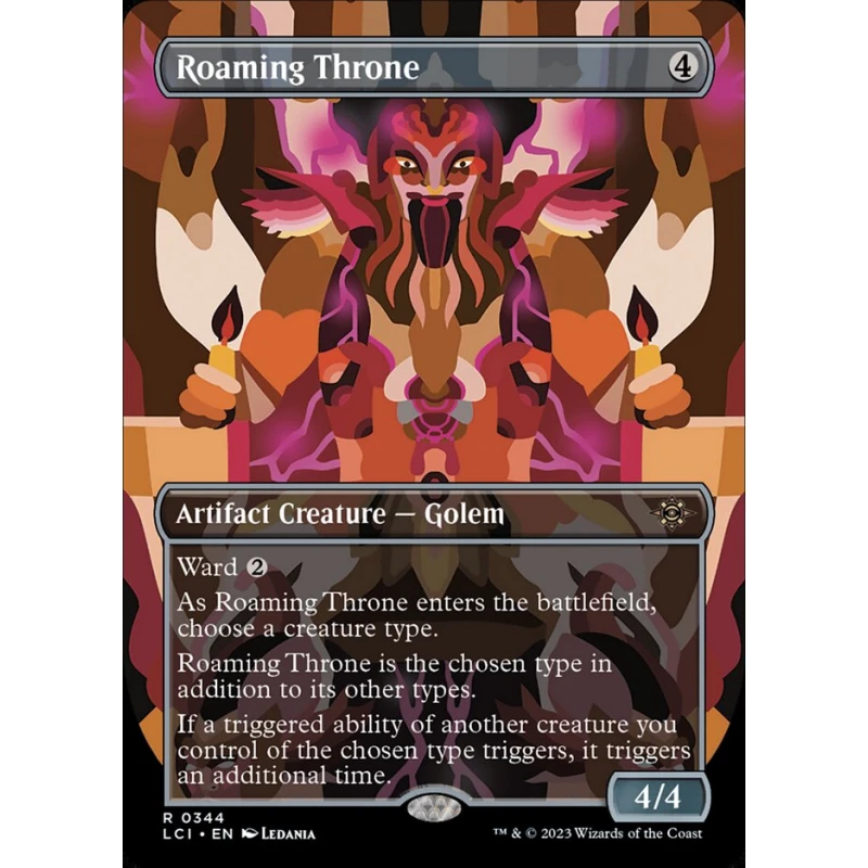 Roaming Throne is an artifact creature golem card from the LCI set, illustrated by Ledania. It features unique ward ability and type-choosing mechanic. This is a normal printing card in English. It is playable in various casual and some niche meta decks.