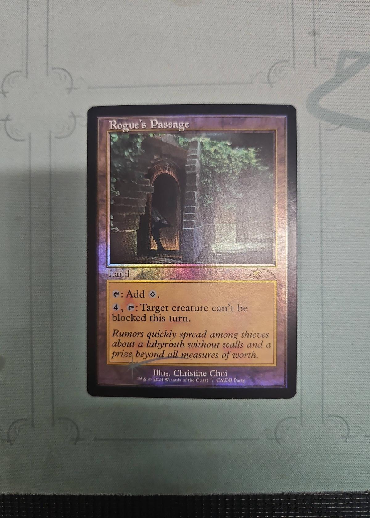 Rogue's Passage from the 2024 Commander Party set, illustrated by Christine Choi. This is a foil version, featuring the unique land ability to make creatures unblockable for a turn. This card is popular and playable in Commander (EDH) decks for its utility. Set code and language details are visible as 'CMDR Party' and English respectively. Great for collectors and Commander players looking for a foil edition.