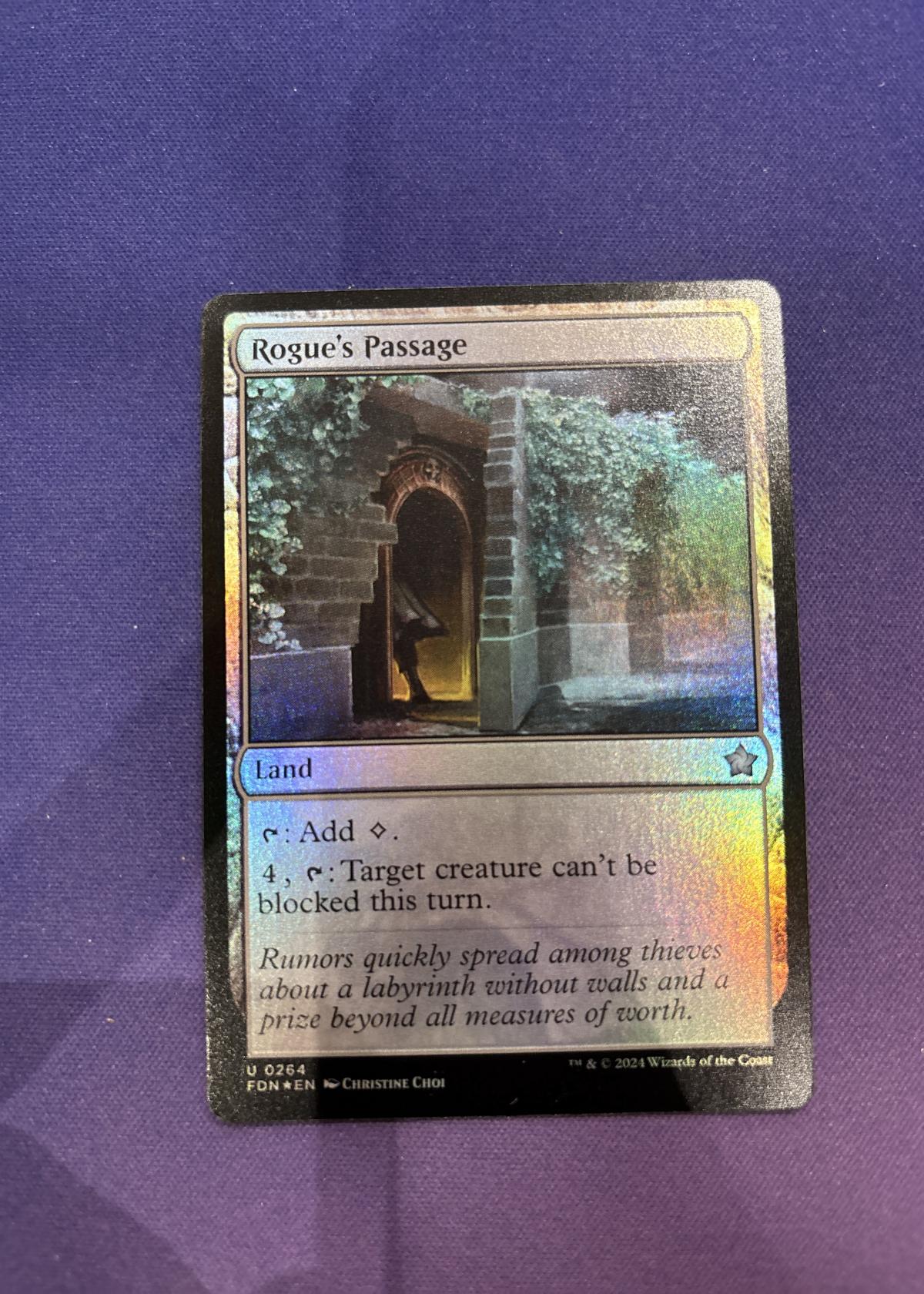 Rogue's Passage is a popular land card from Magic: The Gathering, illustrated by Christine Choi. This card is from the 'FALLOUT' set (FDN), card number 264, printed in English, and features a foil treatment. Rogue's Passage is a staple utility land in many Commander and casual decks due to its ability to allow a creature to be unblockable for a turn, making it playable in various formats. This is the foil version, which adds extra collectible appeal.