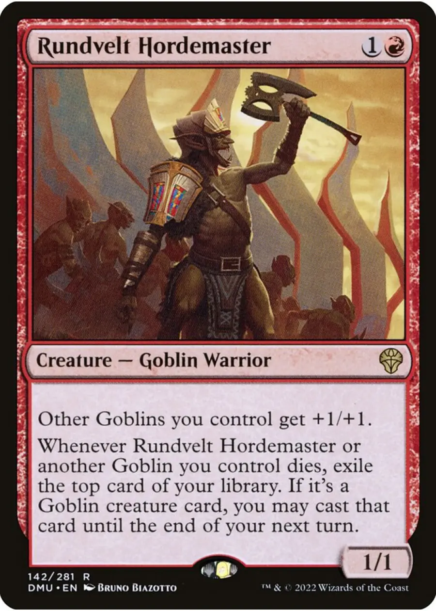 Whenever this creature or another Goblin you control dies, exile the top card of your library. If it's a Goblin creature card, you may cast that card until the end of your next turn. - P / T