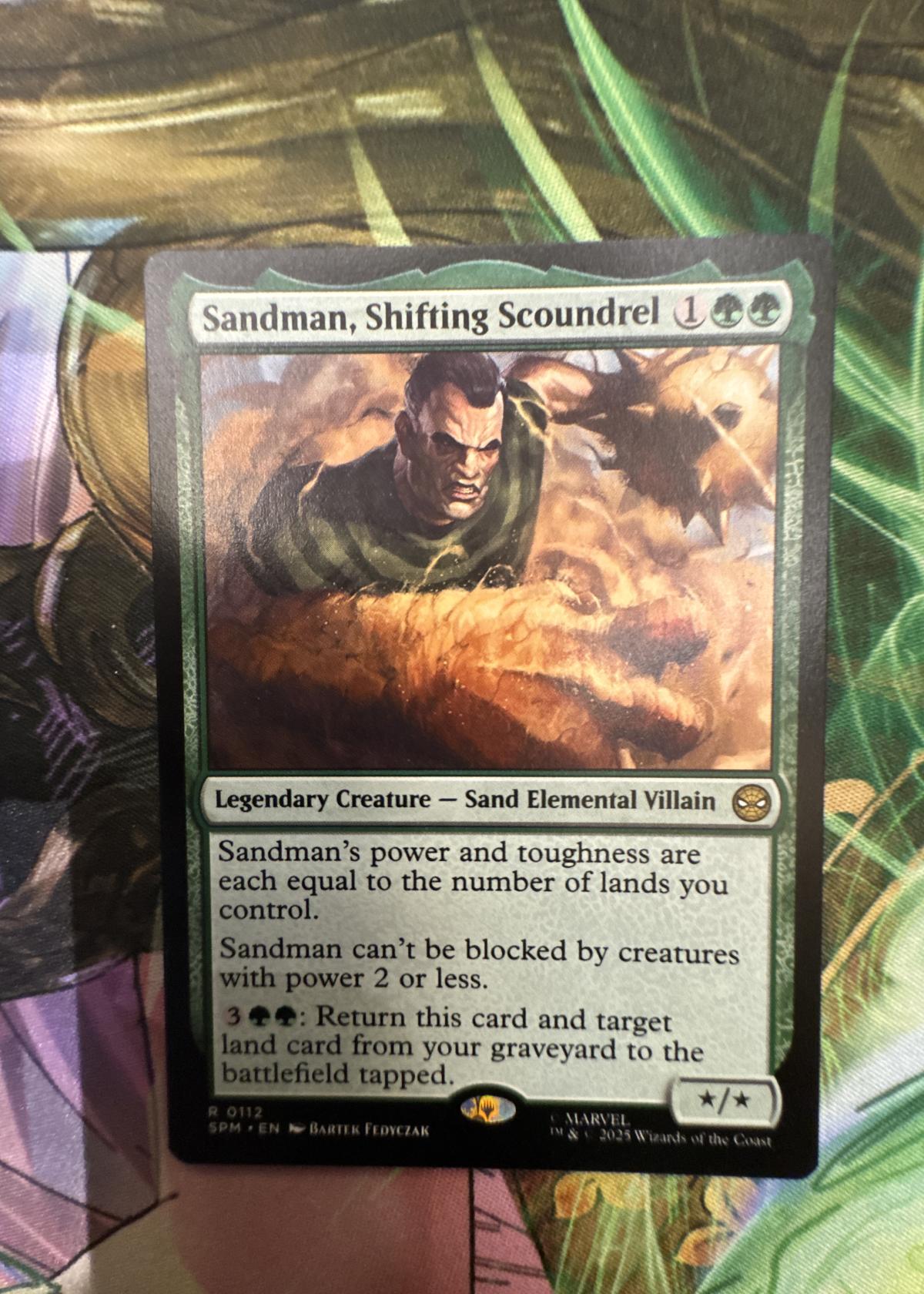 Sandman, Shifting Scoundrel is a legendary creature card from the Magic: The Gathering Marvel set, illustrated by Bartek Fedyczak. Its power and toughness are equal to the number of lands you control and has abilities related to evasion and graveyard recursion. This version is in English, set code SPM, and features a non-foil (normal) printing. The card is generally more collectible and thematic for Marvel fans, rather than being a current meta staple.