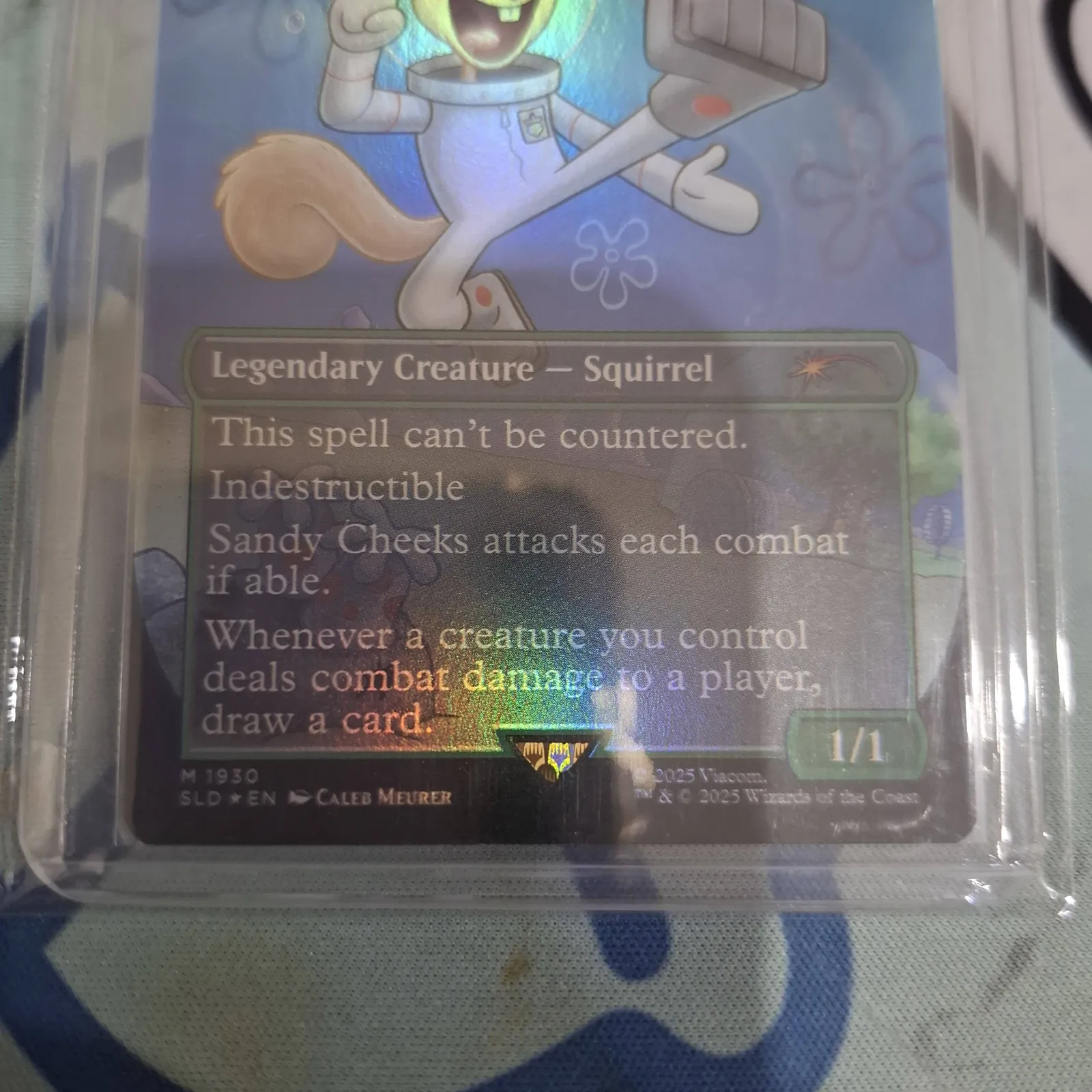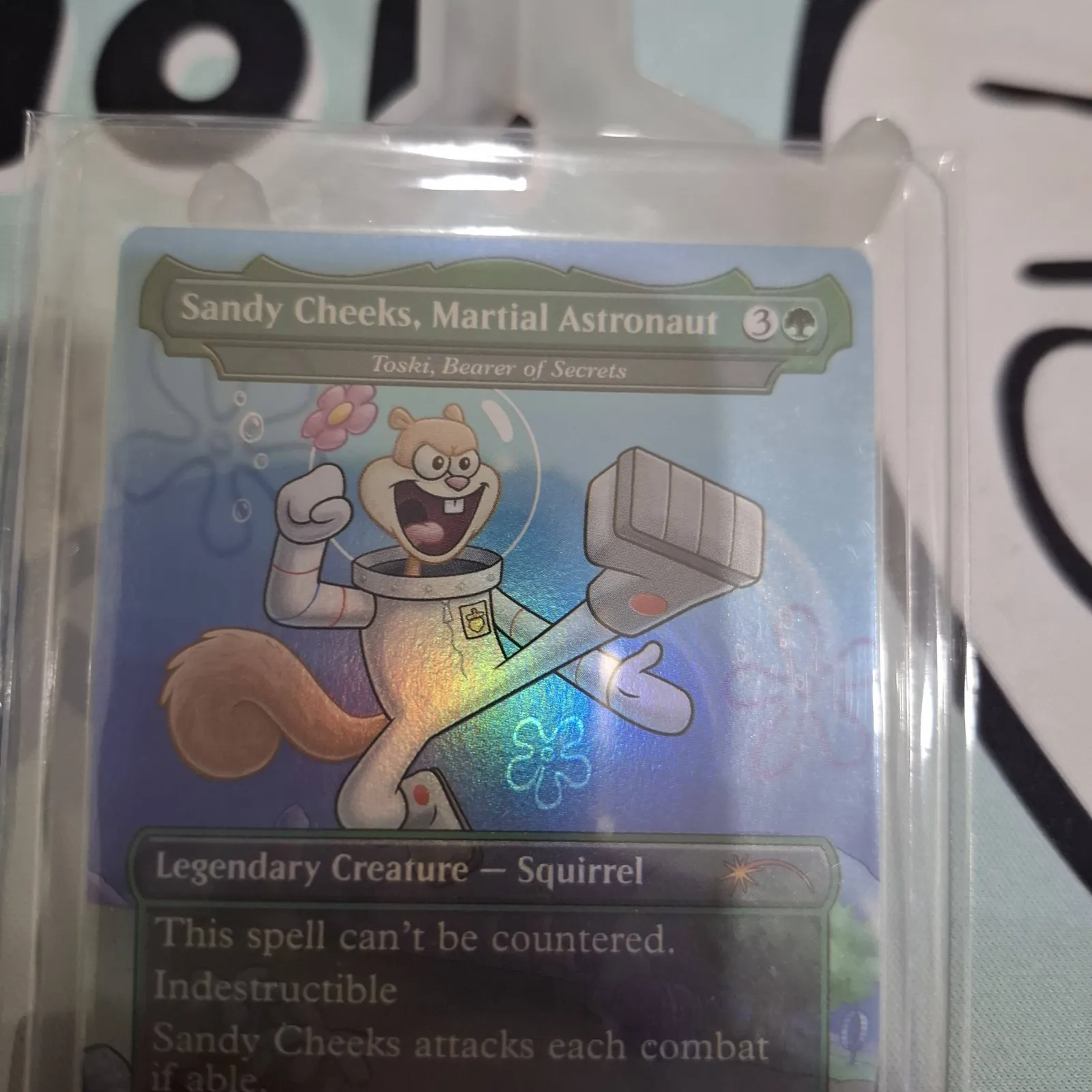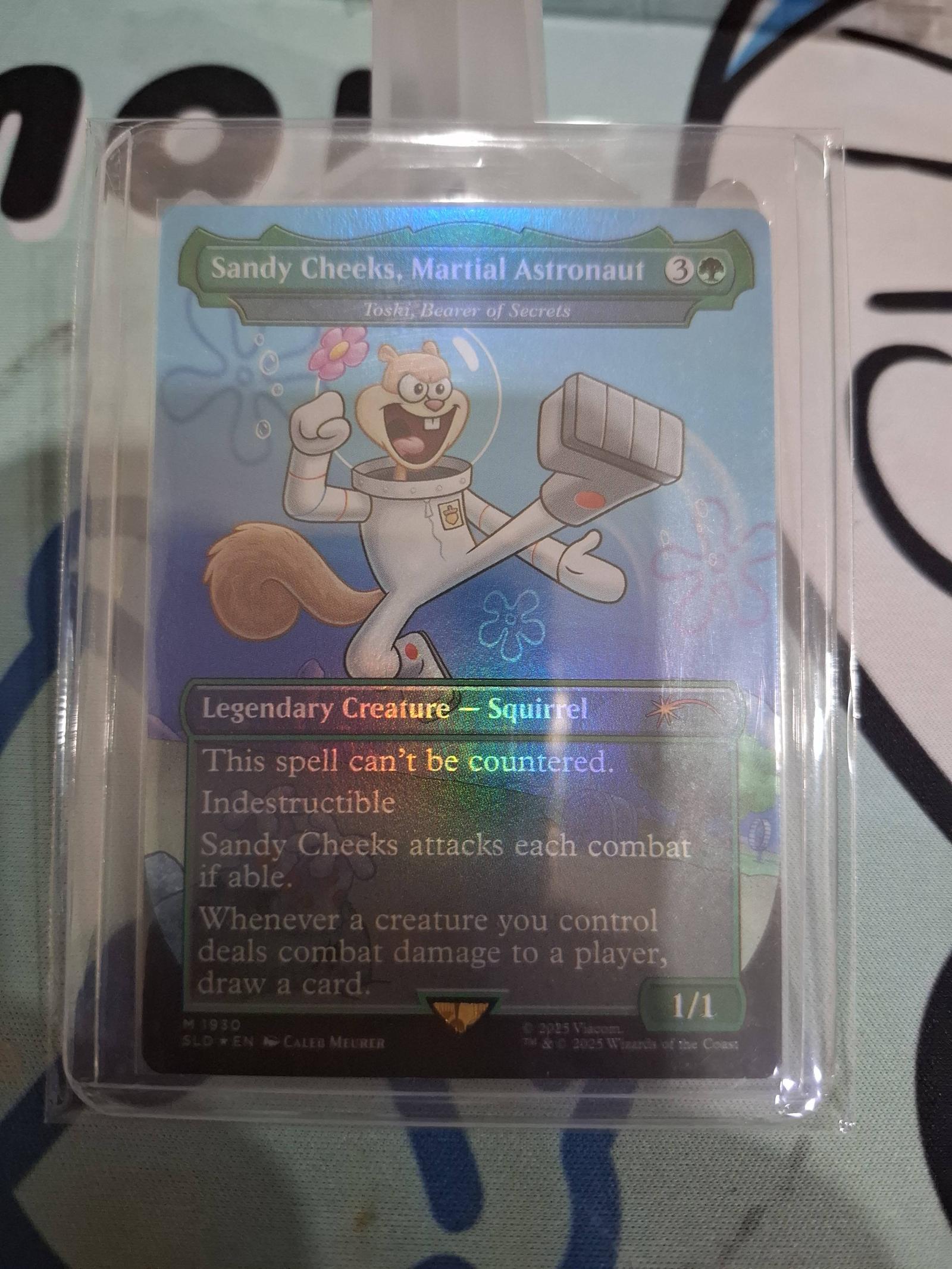 A foil trading card featuring Sandy Cheeks as a Legendary Creature - Squirrel. The card includes abilities such as being indestructible, an uncounterable spell, and combat damage effects. Card is encased in a protective sleeve.