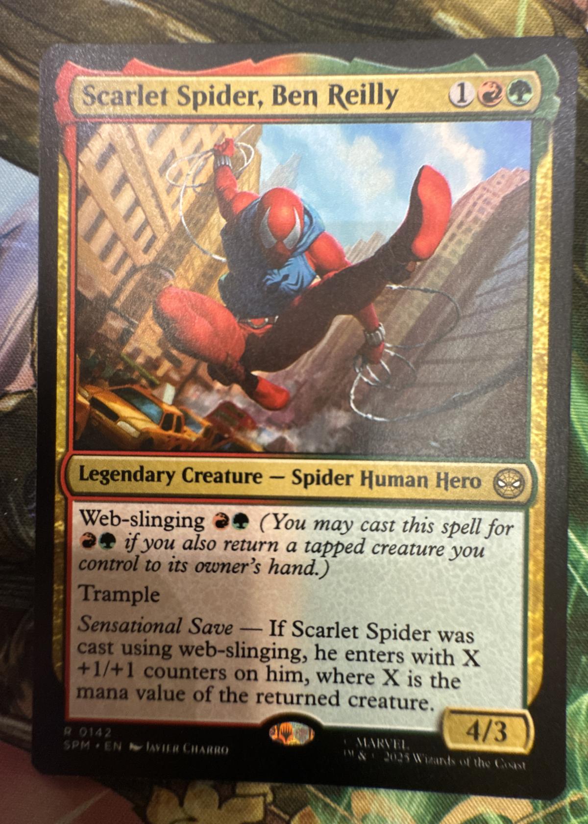 Sensational Save — If Scarlet Spider was cast using web-slinging, he enters with X +1/+1 counters on him, where X is the mana value of the returned creature. - P / T