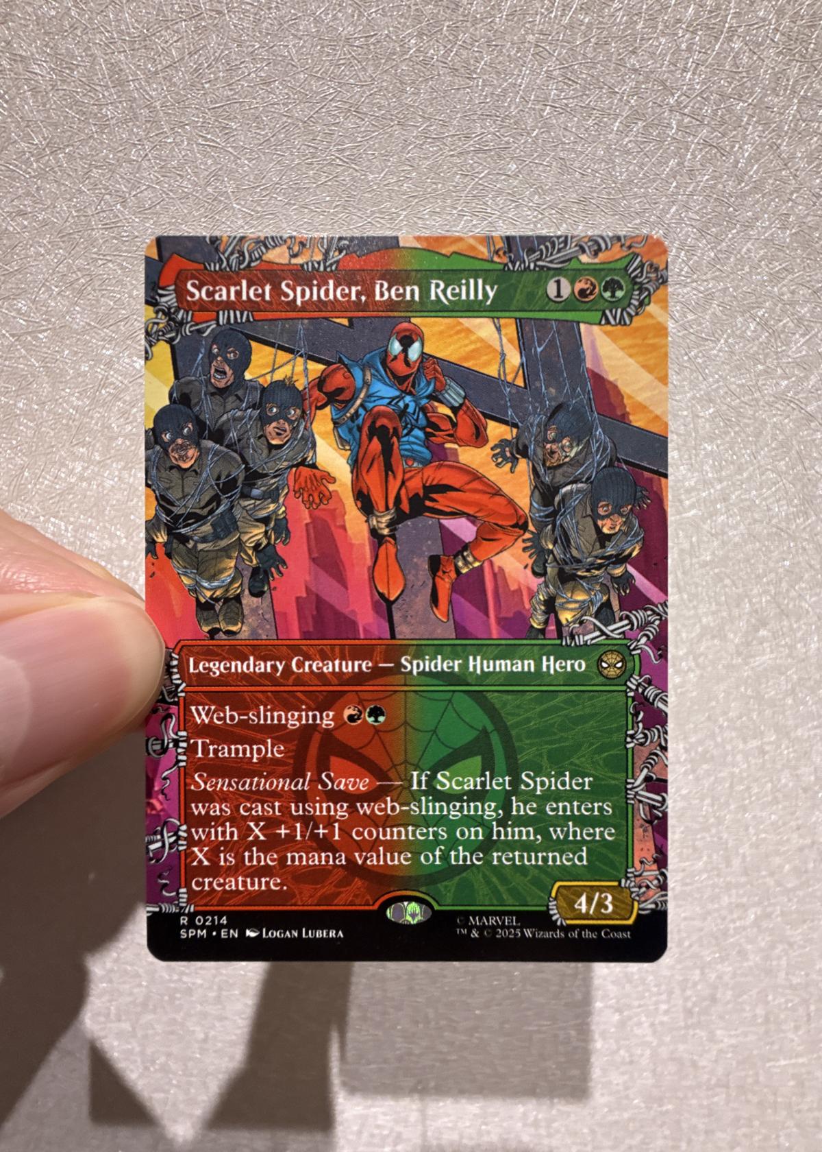 Scarlet Spider, Ben Reilly is a legendary creature card from the Marvel crossover set. This is card 214 from the SPM set, featuring showcase artwork by Logan Lubera. The card is in English and has a normal finish, not foil. As a Legendary Creature – Spider Human Hero, it includes Web-slinging, Trample, and Sensational Save abilities, making it both collectible and potentially playable in supported Magic: The Gathering formats. Artwork and Marvel branding make this card a standout for collectors.