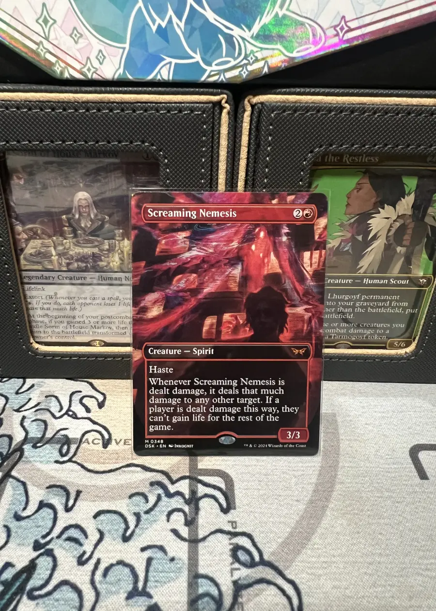 Whenever Screaming Nemesis is dealt damage, it deals that much damage to any other target. If a player is dealt damage this way, they can't gain life for the rest of the game. - P / T