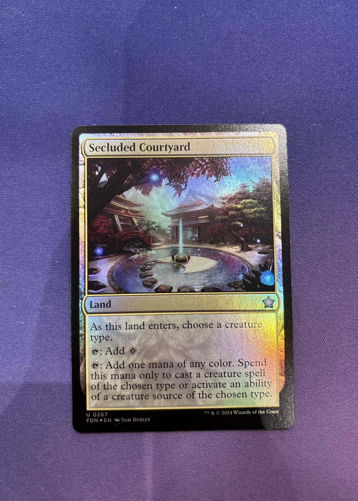 Secluded Courtyard is a land card illustrated by Sam Burley from the set 'Fallout: Deck of Many Things' (FDN). This is an English (EN) foil card with collector number 267. The card is useful in tribal Magic decks, making it both playable in meta and collectible. Its foil treatment and beautiful artwork add extra appeal for collectors.