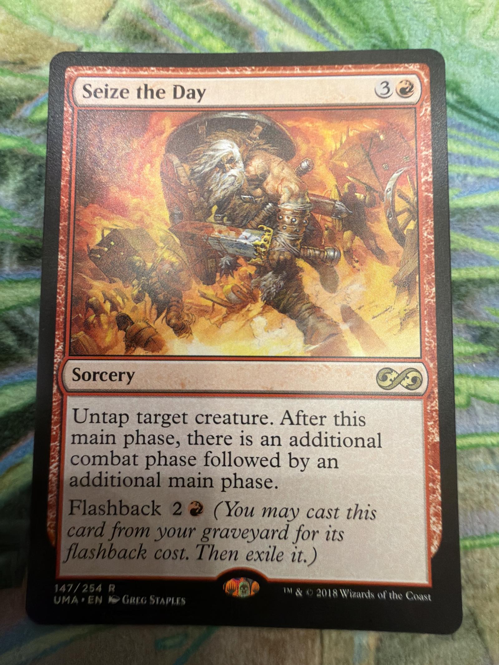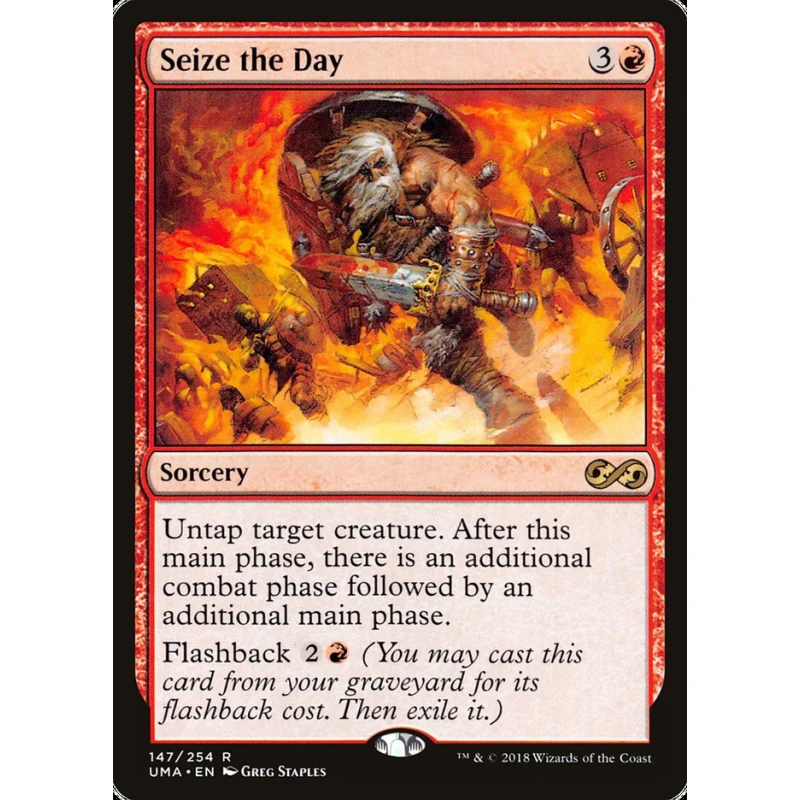 Seize the Day from the Ultimate Masters set (UMA), illustrated by Greg Staples. This is a rare sorcery card that untaps a target creature and grants an additional combat and main phase, with a flashback cost. The card is in English and is a normal (non-foil) printing. Playable in various casual and some combo decks, valued for its ability to extend combat opportunities.