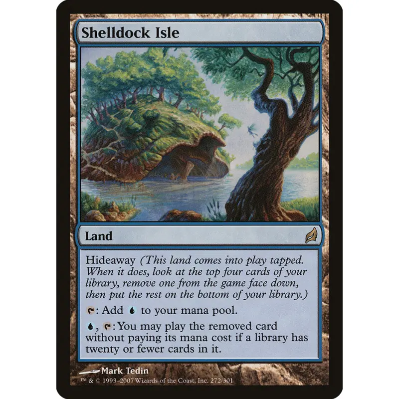 Shelldock Isle from the Lorwyn set, illustrated by Mark Tedin. This blue Land card features the Hideaway mechanic. The card is normal printing and part of the Lorwyn (LRW) set. Playable in niche blue-based decks using Hideaway strategy.