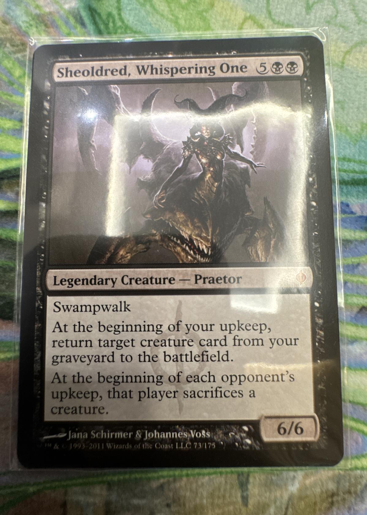 Sheoldred, Whispering One is a powerful Legendary Creature - Praetor card from the Magic: The Gathering New Phyrexia set. Illustrated by Jana Schirmer & Johannes Voss, this card is a staple in Commander (EDH) and reanimator strategies, known for its ability to recur creatures from your graveyard while forcing opponents to sacrifice their own. Non-foil version. Card set: New Phyrexia. Highly playable and collectible, especially in black-heavy decks.