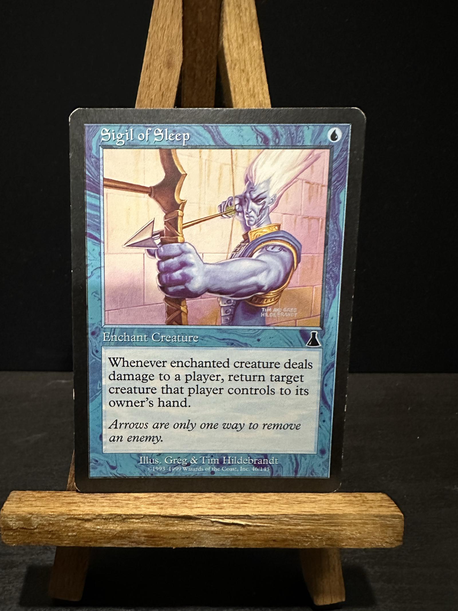 Sigil of Sleep from the Ice Age set (1995). Illustrated by Greg & Tim Hildebrandt. This is a playable blue enchantment card with the ability to return target creature to its owner's hand when the enchanted creature deals damage to a player. Card number 46 in the set. Non-foil printing.