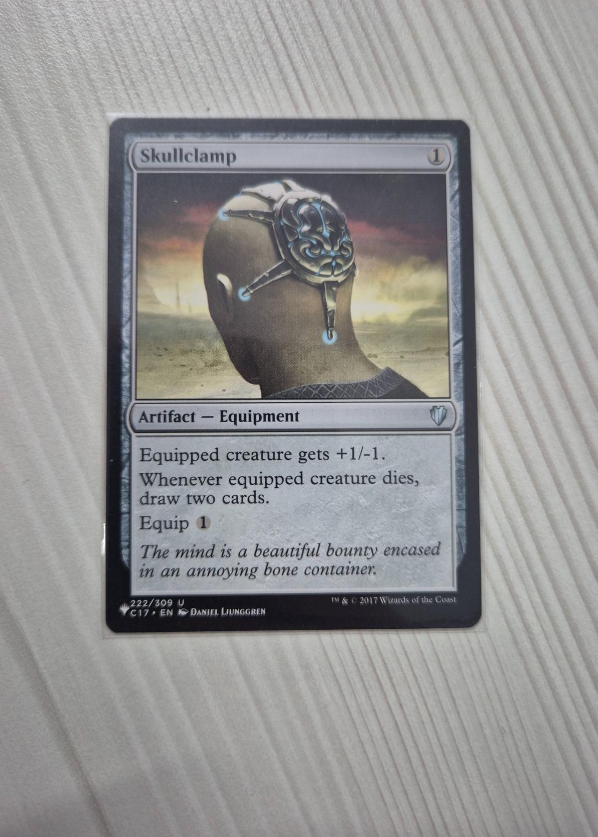 Skullclamp is an Artifact – Equipment card illustrated by Daniel Ljunggren, released in Commander 2017 (C17). This card is widely recognized for its high playability, especially in Commander and Legacy formats, where it's prized for its powerful card draw ability. Equipped creatures get +1/-1, and whenever an equipped creature dies, you draw two cards. Its unique ability makes it a staple in many competitive and collectible decks. This specific card is not foil.