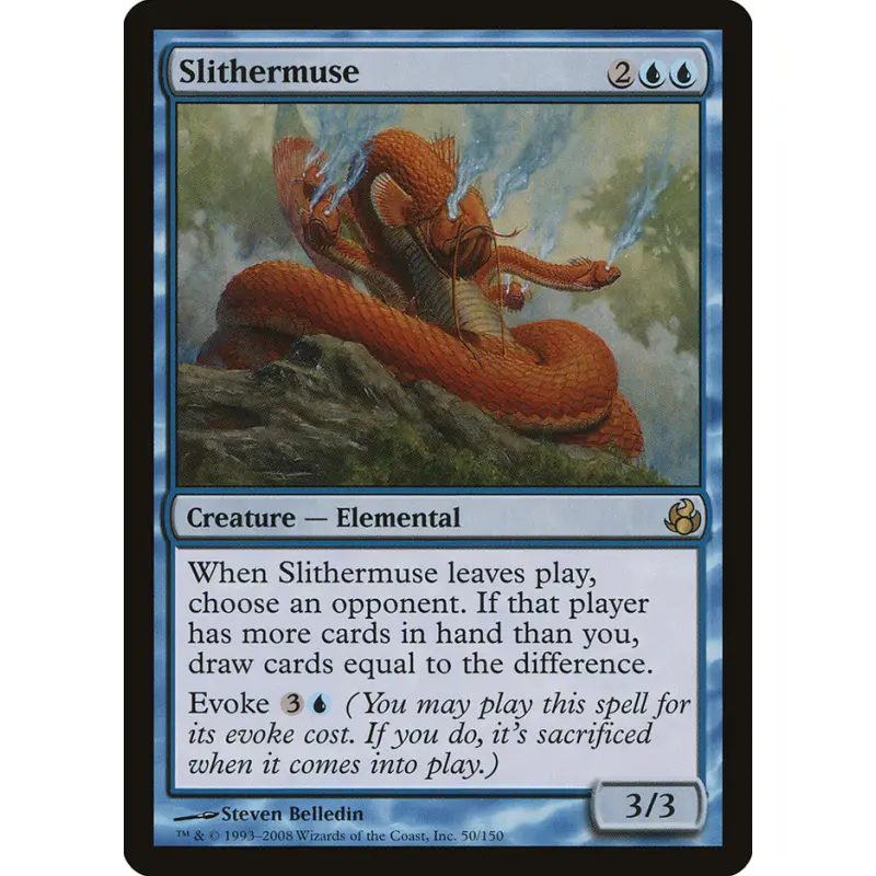 Slithermuse from the Morningtide set, illustrated by Steven Belledin. This is a non-foil card, numbered 50 out of 150. The card is a blue Elemental creature with interesting hand-size card draw mechanics upon leaving play, useful in various casual and some competitive decks.