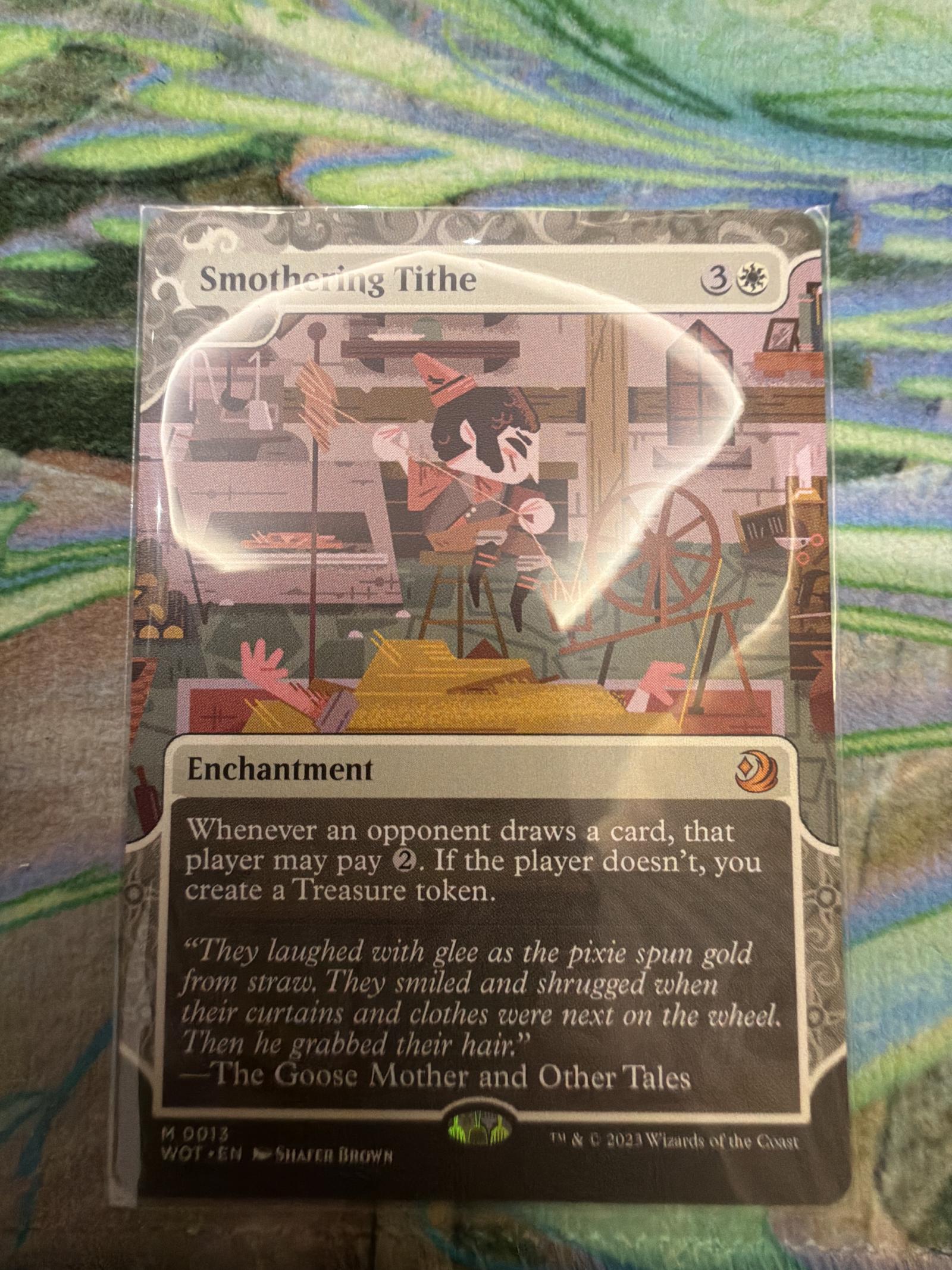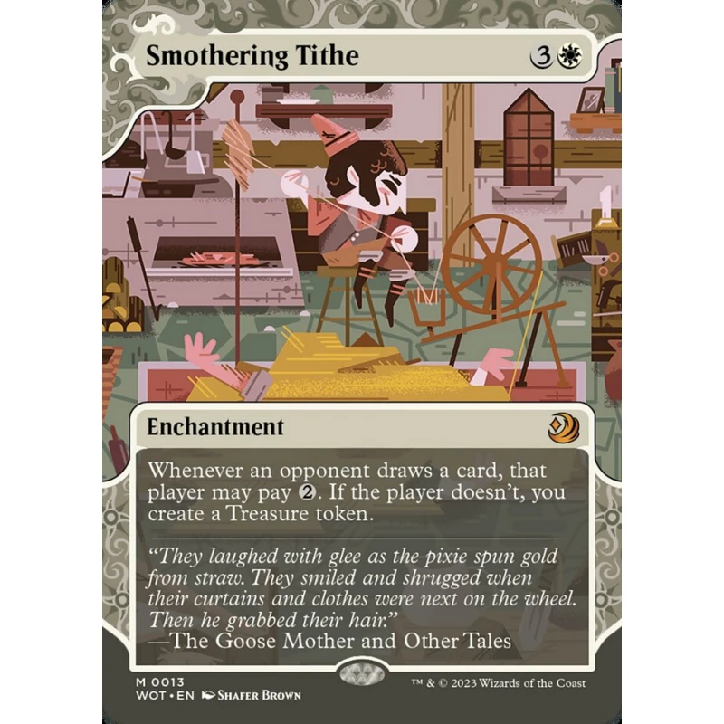 Smothering Tithe from the WOT set, illustrated by Shafer Brown. This is an extended art enchantment card in English. It is a normal printing, popular for both collectors and playable in many Magic: The Gathering formats as a strong card advantage tool.