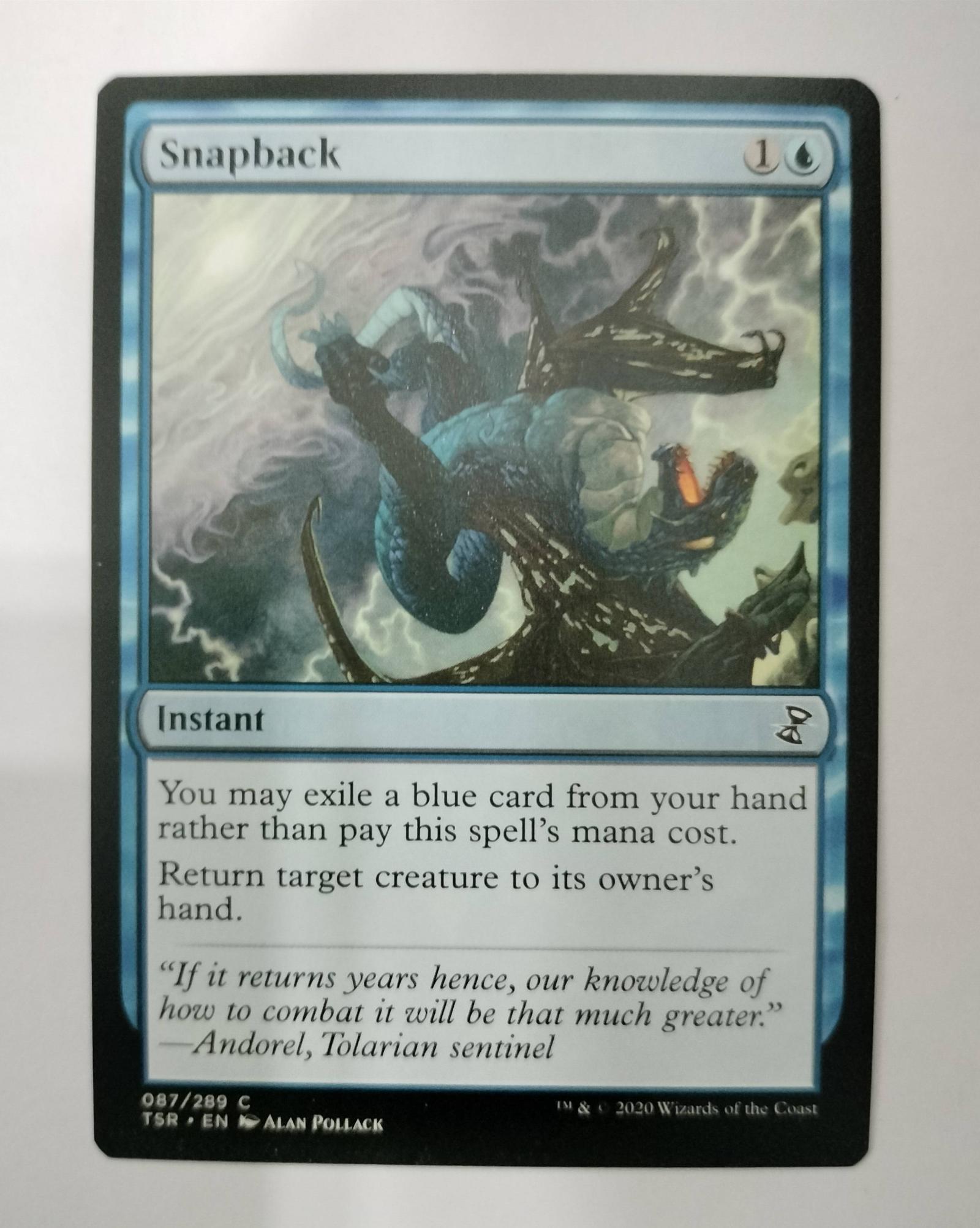 Snapback is an instant card from the Magic: The Gathering set Time Spiral Remastered (TSR). It allows you to return a target creature to its owner's hand and can be cast by exiling a blue card instead of paying its mana cost. This card is illustrated by Alan Pollack and is a common rarity. It is playable in certain casual and historical formats. The card shown is a normal printing, English language edition.
