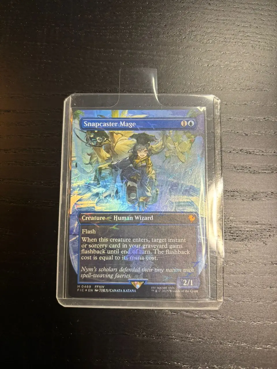 Condition and grading Near Mint — ungraded. Card is stored in a rigid top-loader and clear sleeve; edges and corners appear clean in photos and the surface shows the bright, intact Chocobo Track foil. Sold as an ungraded collectible card. Notable features Borderless alternate art print of the staple Snapcaster Mage with the Chocobo Track foil treatment — a visually striking rainbow foil pattern across the entire face. This is a specialty promotional/variant print produced for the Commander: FINAL FANTASY (FIC) crossover, making it a distinctive piece for both MTG and Final Fantasy collectors. Artist, set and foil status Artist credit on the card reads CANATA KATANA. Set identification: Commander: FINAL FANTASY (FIC) — foil, borderless variant with Chocobo Track pattern. Card language appears to be English (EN) as shown on the face. Playability and collectible value Snapcaster Mage remains an iconic and highly recognizable card in Magic’s history, and this borderless Chocobo Track foil is primarily a collector’s/commander-focused variant rather than a standard tournament staple. Its value comes from the unique artwork, licensed crossover appeal with Final Fantasy, and the full-card foil treatment. Ideal for display, alternative-art Commander lists, or adding a standout foil to a collection. Other observations Card is offered exactly as pictured; back is shown and looks consistent with genuine card stock. Item is ungraded—photos show condition and storage. If you need additional close-ups of the corners, edges, or the holo foil texture, I can provide more images on request.