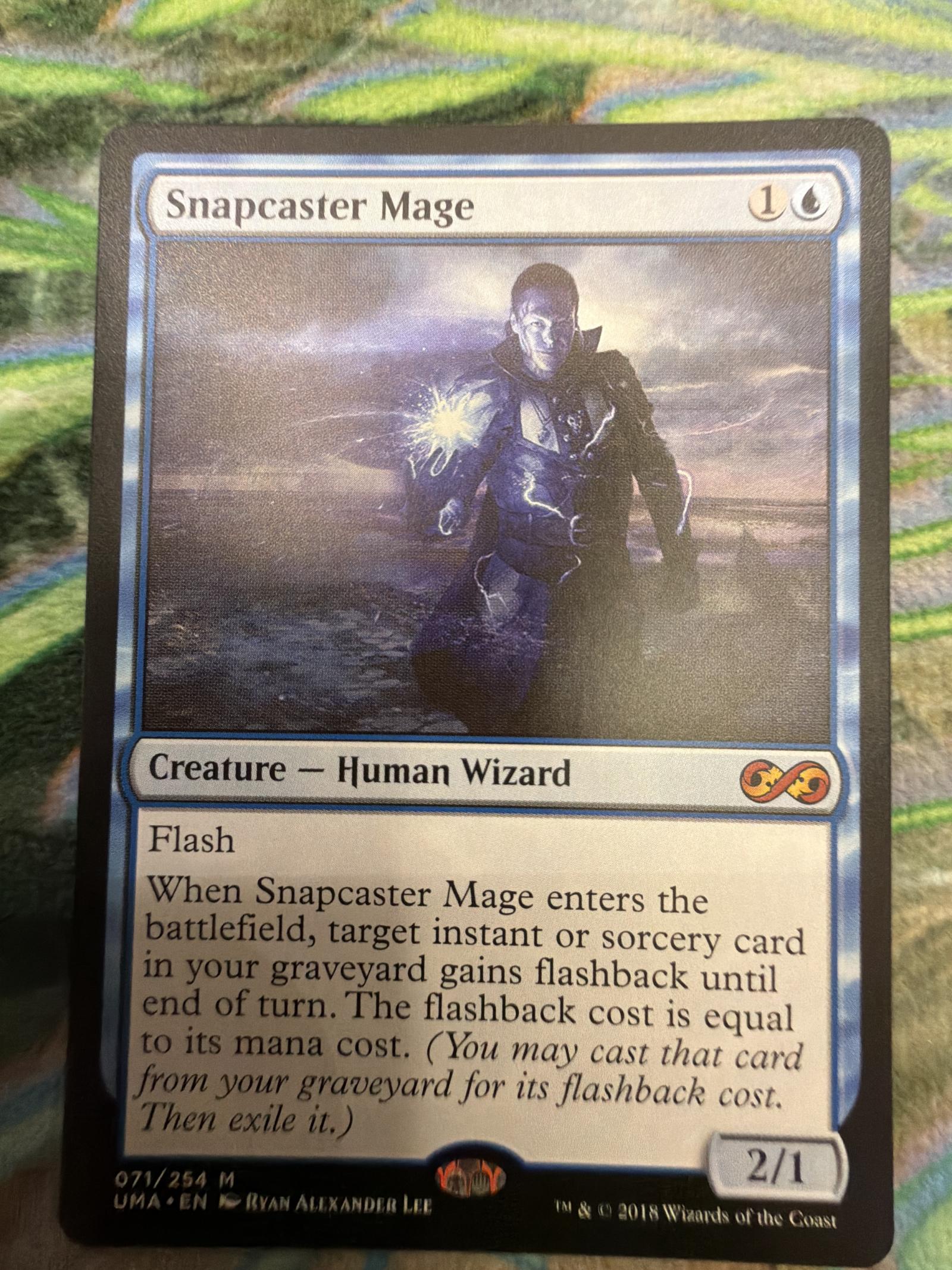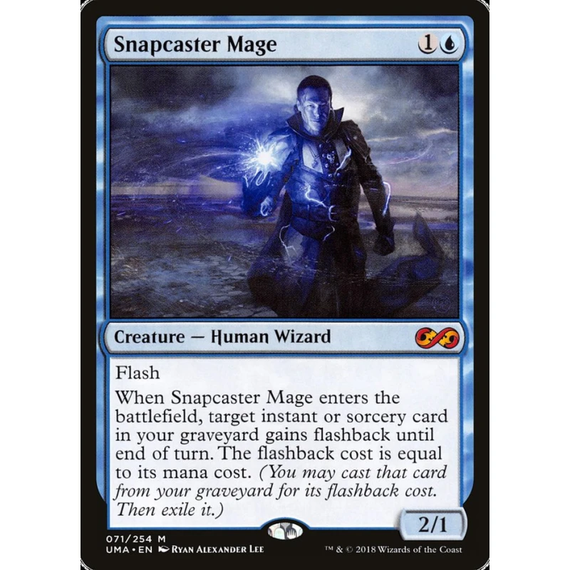Snapcaster Mage from the Ultimate Masters (UMA) set, card number 71/254. Illustrated by Ryan Alexander Lee. This is a normal printing treatment card in English. Snapcaster Mage is a staple in many formats due to its flashback ability, making it highly playable in the Magic: The Gathering meta. The card is not foil.
