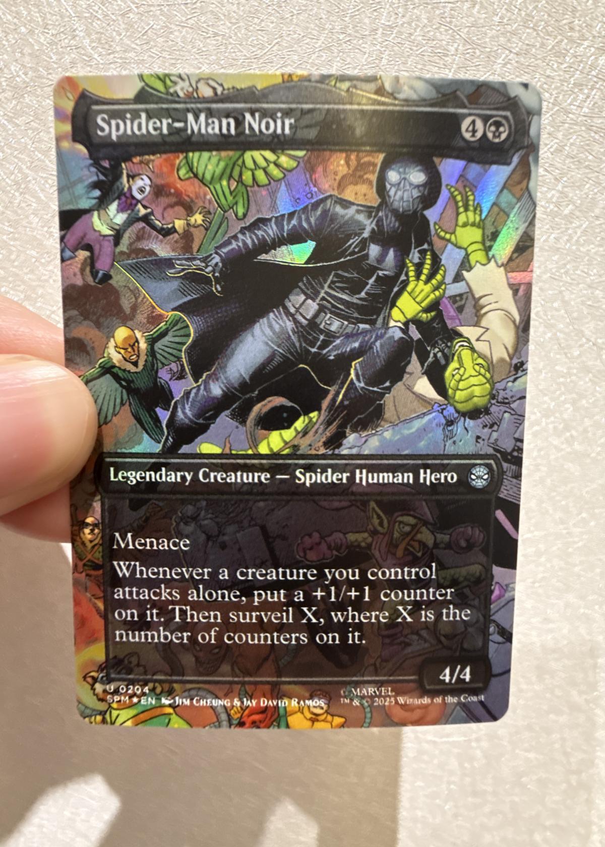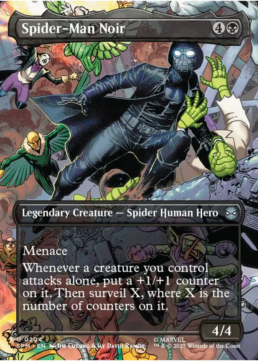 Spider-Man Noir from the Marvel Secret Lair set, illustrated by Jim Cheung & Jay David Ramos. This foil card features a Legendary Creature with Menace and a unique ability that enhances creatures attacking alone. Playable in meta and collectible for Marvel fans.