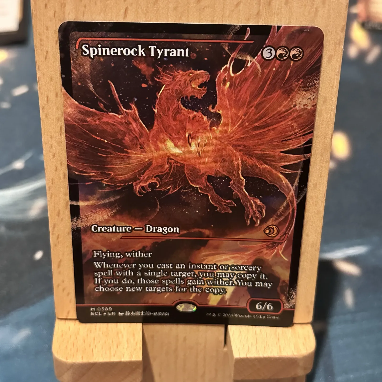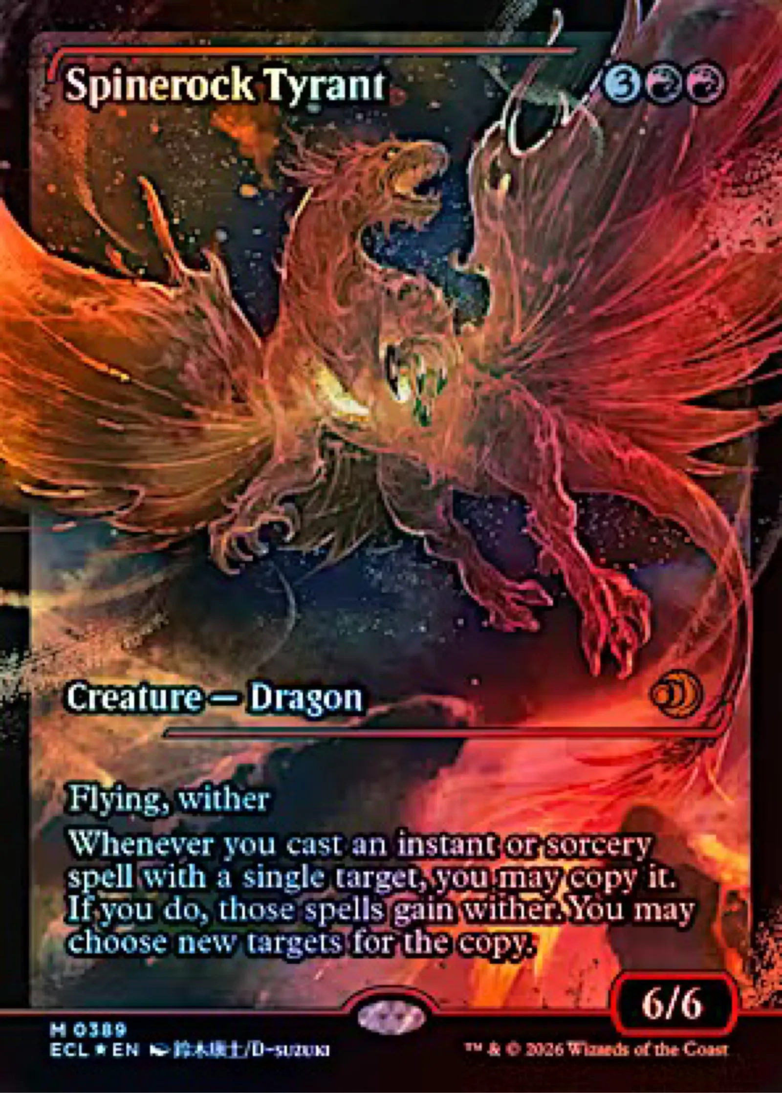 Gameplay and collector notes: Spinerock Tyrant is a 6/6 Dragon with flying and wither and an ability that copies single‑target instants or sorceries (making it attractive in casual, Commander, and foil‑art collector builds). This Japan Showcase foil is more sought after by collectors who prefer alternate art and borderless/showcase treatments; it adds display and foil appeal beyond the normal print. The card is ungraded but preserved in near‑mint condition, making it suitable for play or for upgrading into a graded slab for long‑term investment.