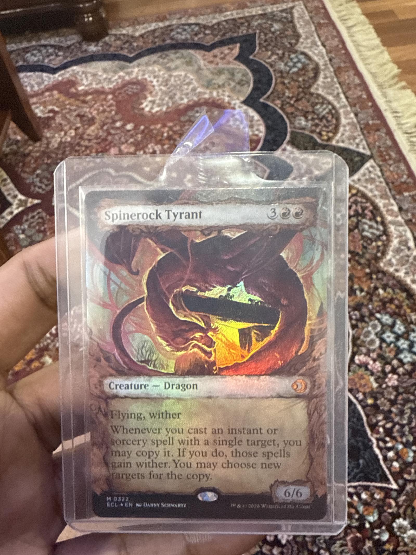 Spinerock Tyrant from the ECL (Extended Core Legends) set, card number 332. This foil version, with art by Danny Schwartz, is a playable creature card in Magic: The Gathering featuring Flying and Wither abilities. The card allows copying instant or sorcery spells with a single target, enhancing strategic gameplay.