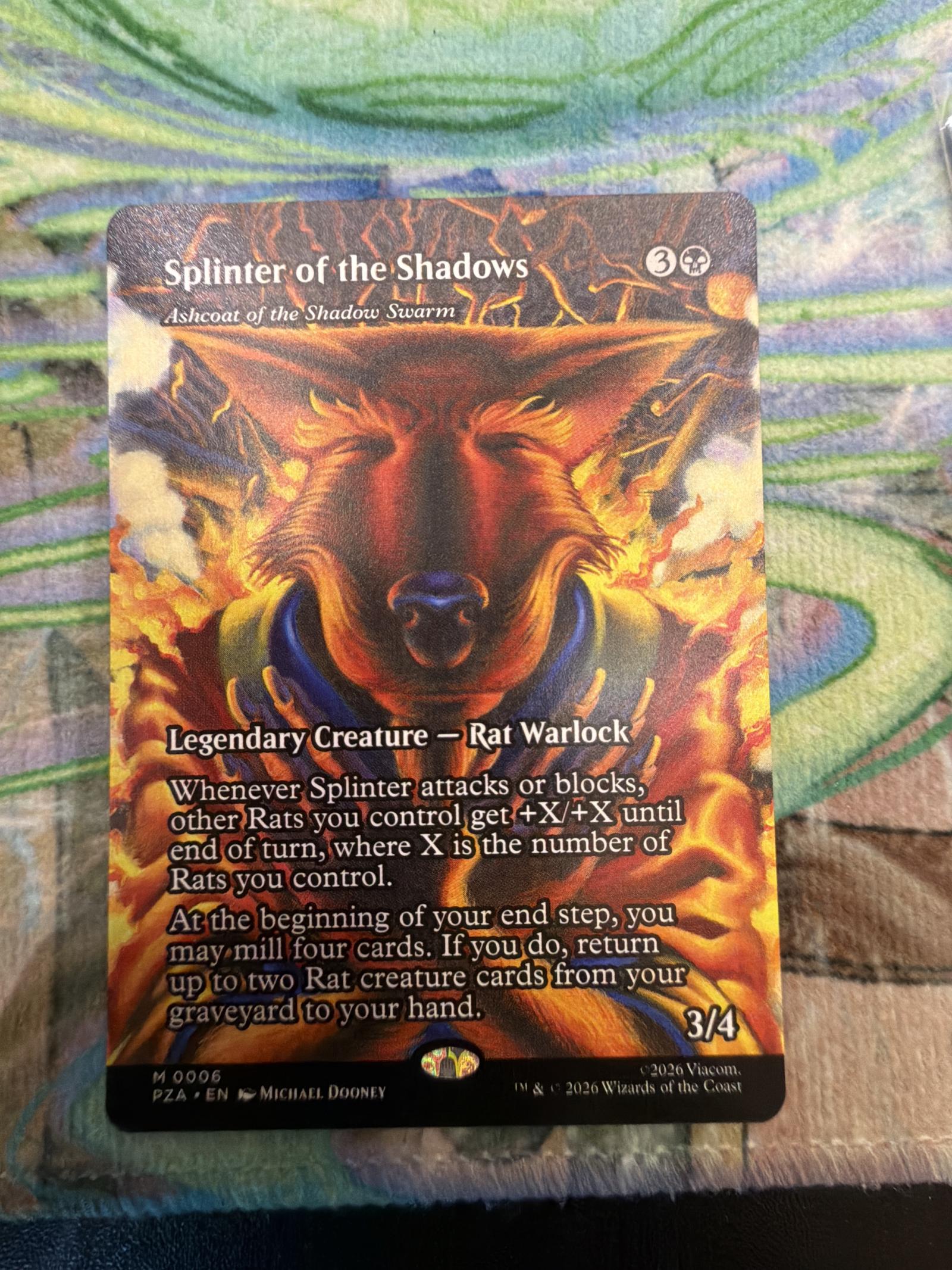 Splinter of the Shadows is a Legendary Creature - Rat Warlock card from the Magic The Gathering set PZA, illustrated by Michael Dooney. This card has a collector number M6 and is in English. It is a normal printing. The card offers strategic playability in decks focusing on Rat creatures by boosting other Rats and recurring them from the graveyard. Suitable for both collectors and players interested in rat tribal synergy.