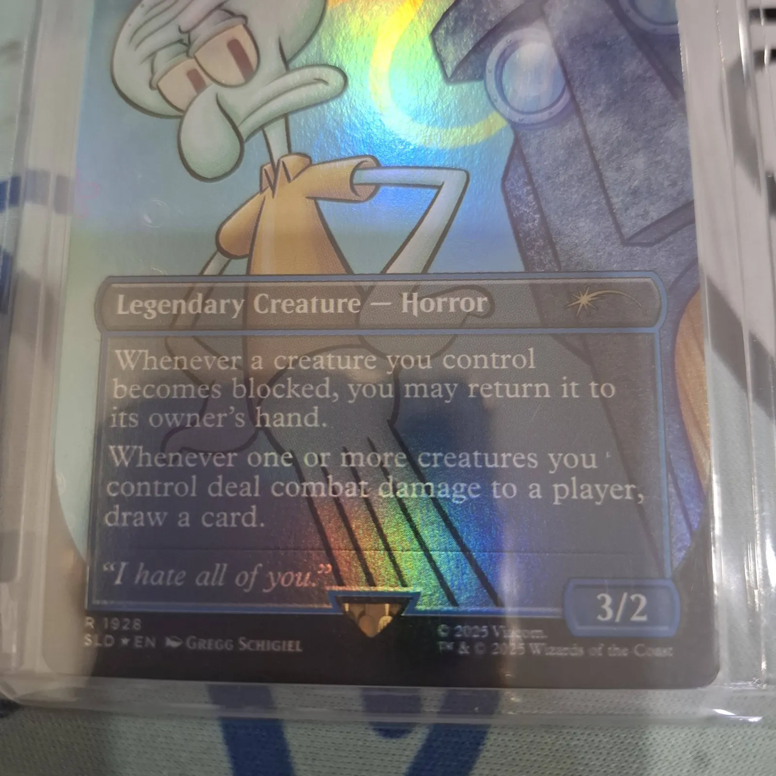 A foil Magic The Gathering featuring Squidward, Sarcastic Snob, Legendary Creature - Horror. Card text includes abilities related to blocking and combat damage drawing cards. The card is encased in a protective sleeve.