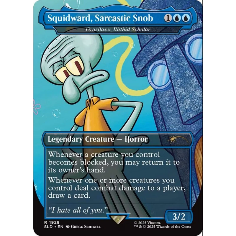 Squidward, Sarcastic Snob from the Secret Lair Drop (SLD) set. Featuring artwork by Gregg Schigiel. This foil card is a playful, collectible piece that is not part of the competitive Magic: The Gathering meta. The card displays a humorous take on Magic cards.
