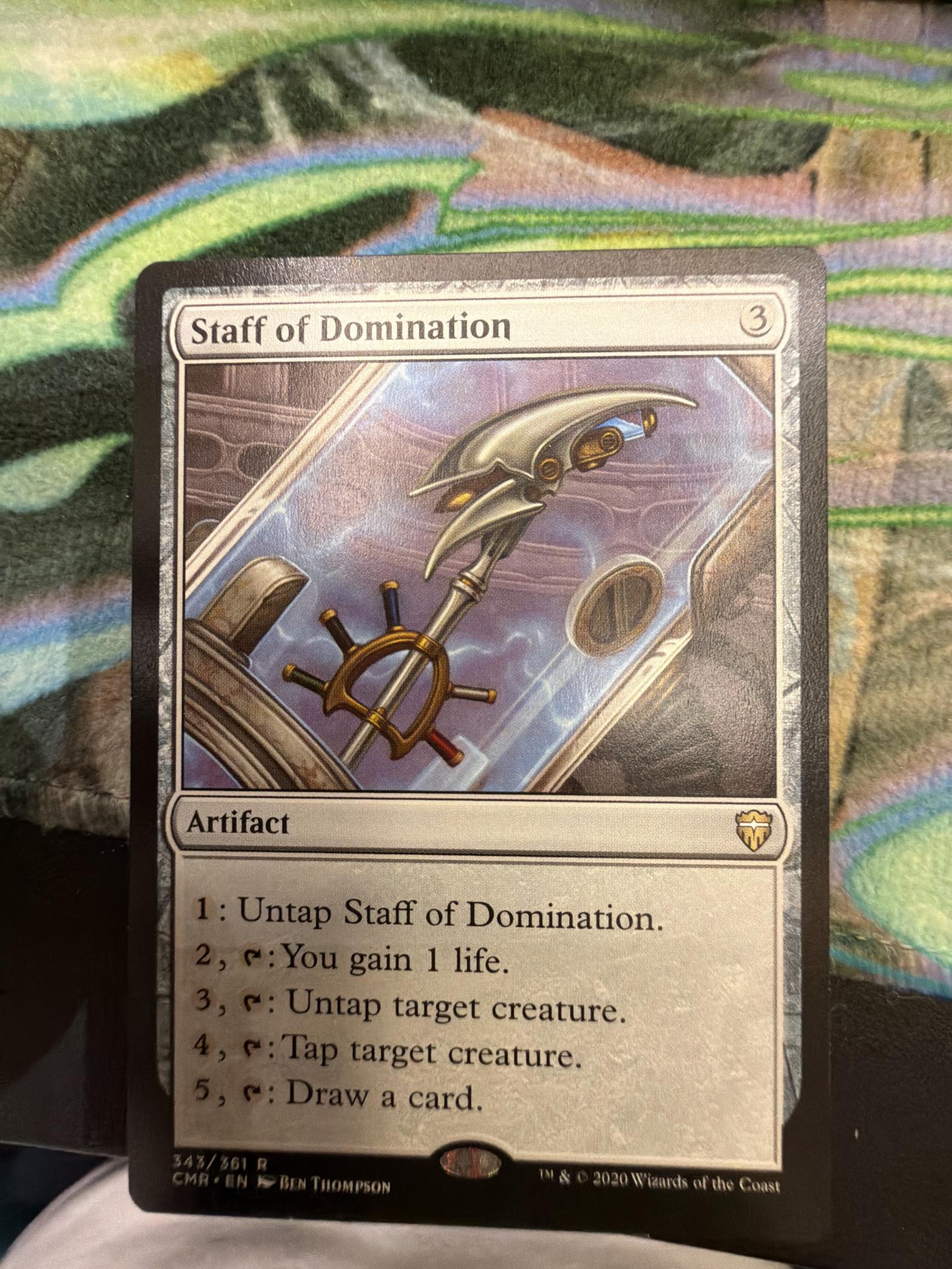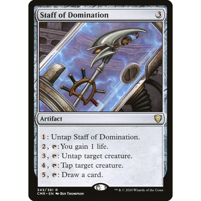 Staff of Domination is a rare artifact from the Commander Legends set, illustrated by Ben Thompson. This card offers versatile abilities allowing you to untap itself, gain life, untap or tap creatures, and draw cards. It is playable in Commander formats and highly valued for its utility. The card shown is a normal (non-foil) printing.