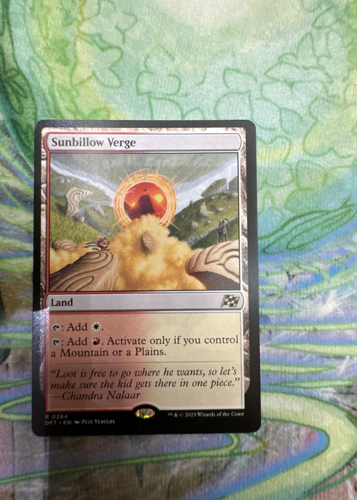 Sunbillow Verge is a rare land card from Magic: The Gathering's 'Outlaws of Thunder Junction' (DFT) set. Illustrated by Pete Venters, this card offers both white and conditional red mana, making it useful in multicolor decks, especially those needing mana fixing for Plains and Mountain synergy. The card is not foil and is in English. With its flexibility and conditionally upgraded mana ability, it is primarily playable but may also be of interest to collectors, particularly set collectors or those completing rare land cycles. The flavor text features a quote by Chandra Nalaar.