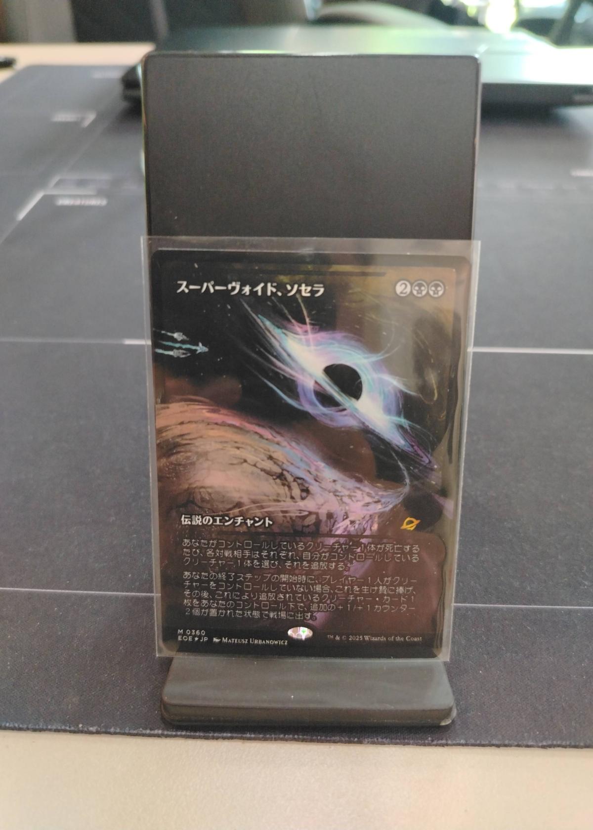 Supervoid, Sozella is a legendary enchantment card from the Magic: The Gathering set 'Outlaws of Thunder Junction: Eldrazi Unbound' (EOE). This is the Japanese language foil treatment version, illustrated by Mateusz Urbanowicz. The collector number for this card is 360. Given its unique art and treatment, it is both playable in certain formats and highly collectible, especially for collectors of Japanese alternate-art cards.