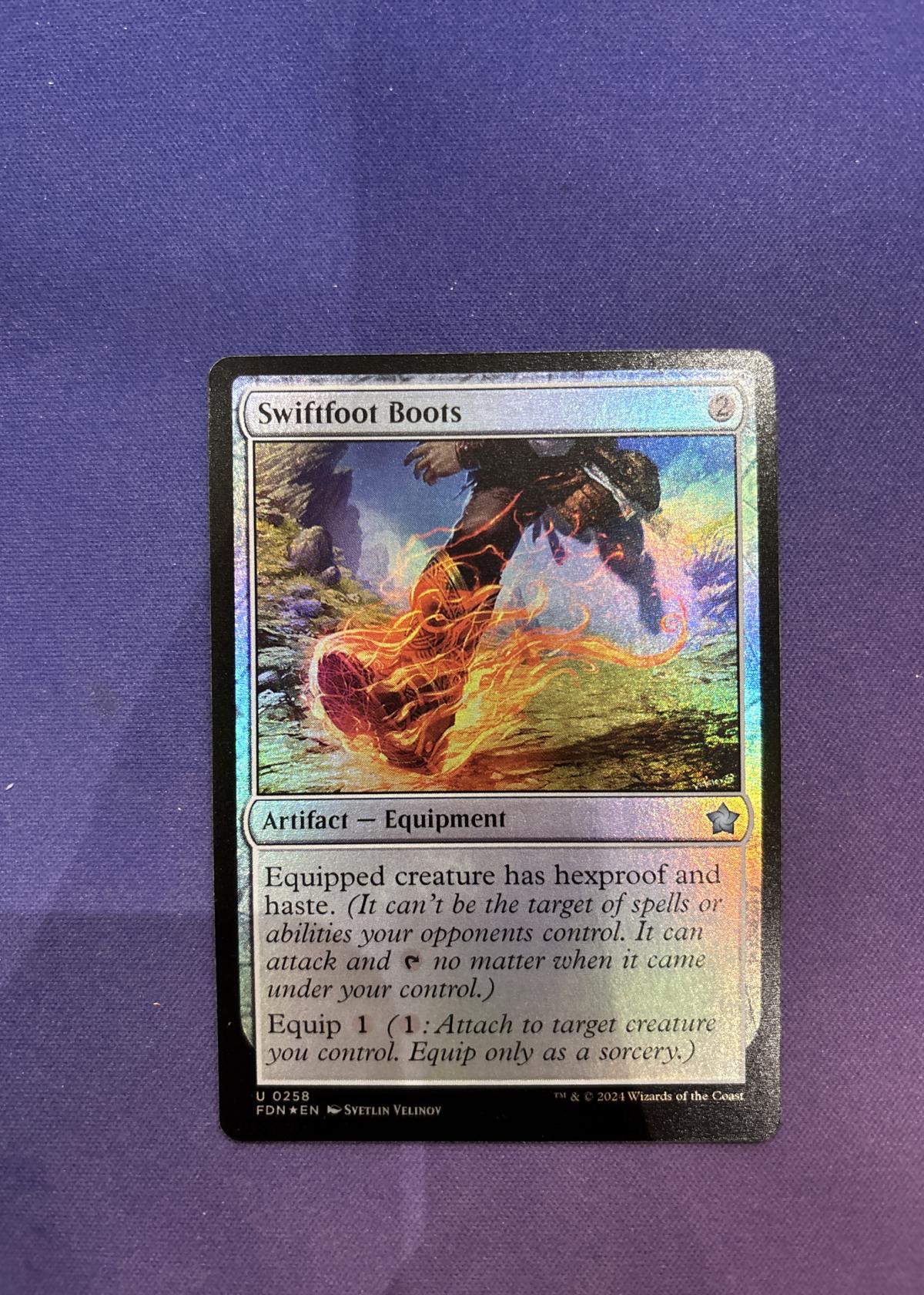 Swiftfoot Boots is a popular artifact equipment card from Magic: The Gathering, illustrated by Svetlin Velinov. This is a foil version from the Forgotten Realms Commander set (FDN), card number 258. The equipped creature gains both hexproof and haste, making it highly playable in Commander and many Magic formats, valued for its utility and protection abilities. The card is printed in English and is often sought after for both play and collection.