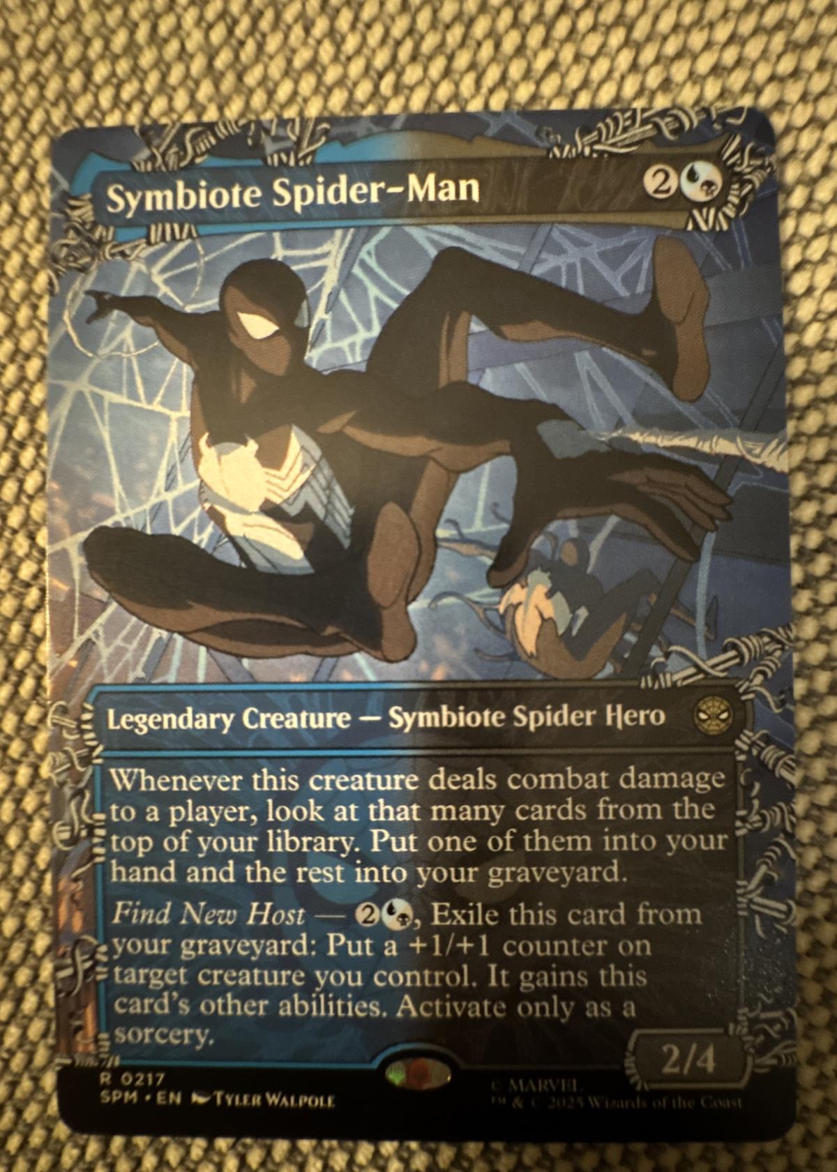 Symbiote Spider-Man is a Legendary Creature – Symbiote Spider Hero from the Universes Beyond: Marvel set. Art by Tyler Walpole. This is an English-language, normal printing card, with collector number 217 from the SPM set. The card offers unique abilities involving library manipulation and graveyard play. It is the sought-after Marvel crossover, highly collectible for both Magic and Marvel fans, and playable for exciting commander or constructed formats.