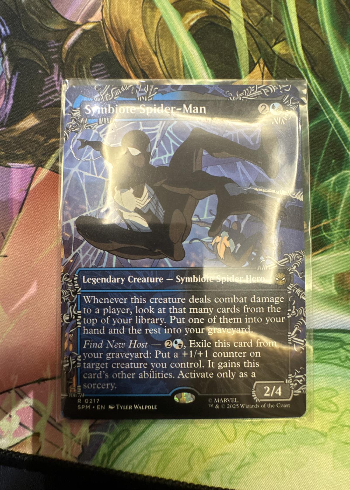 Symbiote Spider-Man is a legendary creature card from the Universes Beyond: Marvel set, illustrated by Tyler Walpole. This card features Black Suit Spider-Man with unique abilities and is a rare, foil-printed card (card number 217, set code SPM, English language). This card is more collectible than meta-playable and is especially notable for Marvel and Magic: The Gathering crossover collectors.