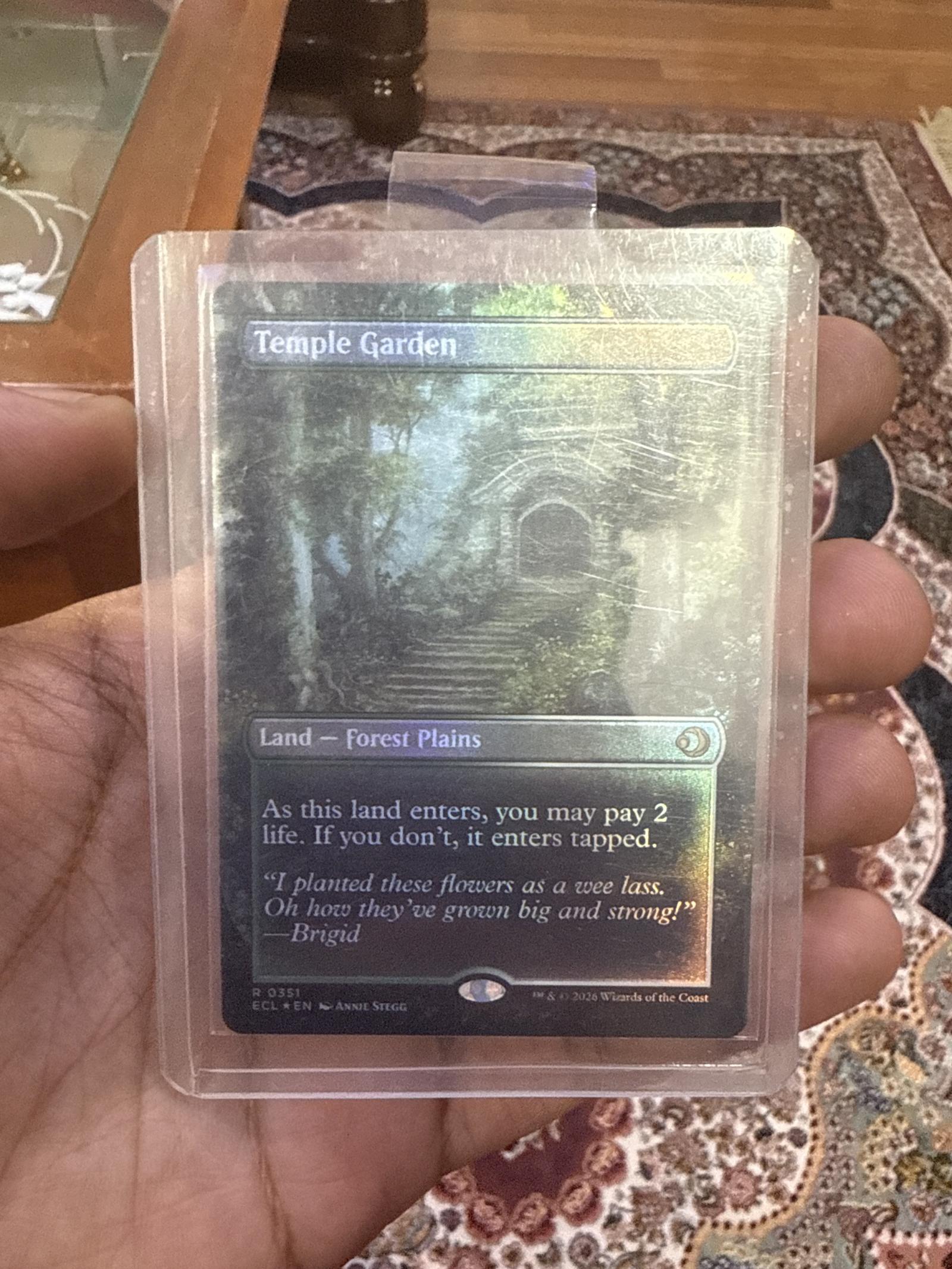 Temple Garden from the set "Eclipse" (2026) featuring art by Annie Stegg. This is a foil card with extended art. Playable land card in many formats, useful in meta decks. Card number 351. English language.