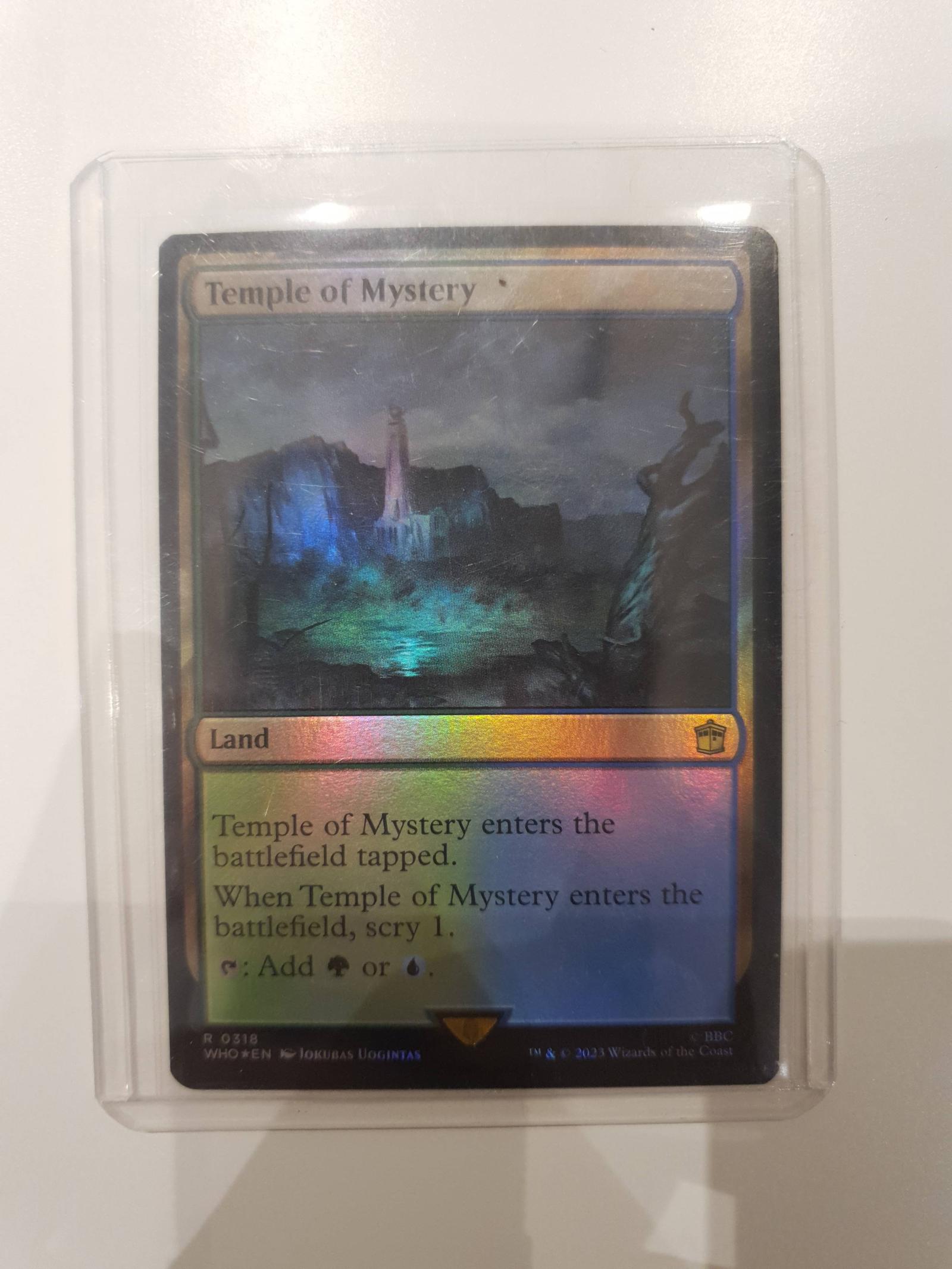 Temple of Mystery from the Double Masters 2022 set (WHO), illustrated by Jokubas Uogintas. This foil land card enters the battlefield tapped and allows you to scry 1, producing either green or blue mana. It is commonly used in multicolor decks and is both collectible and playable in various formats. The card has a collector number 318 and is printed in English.