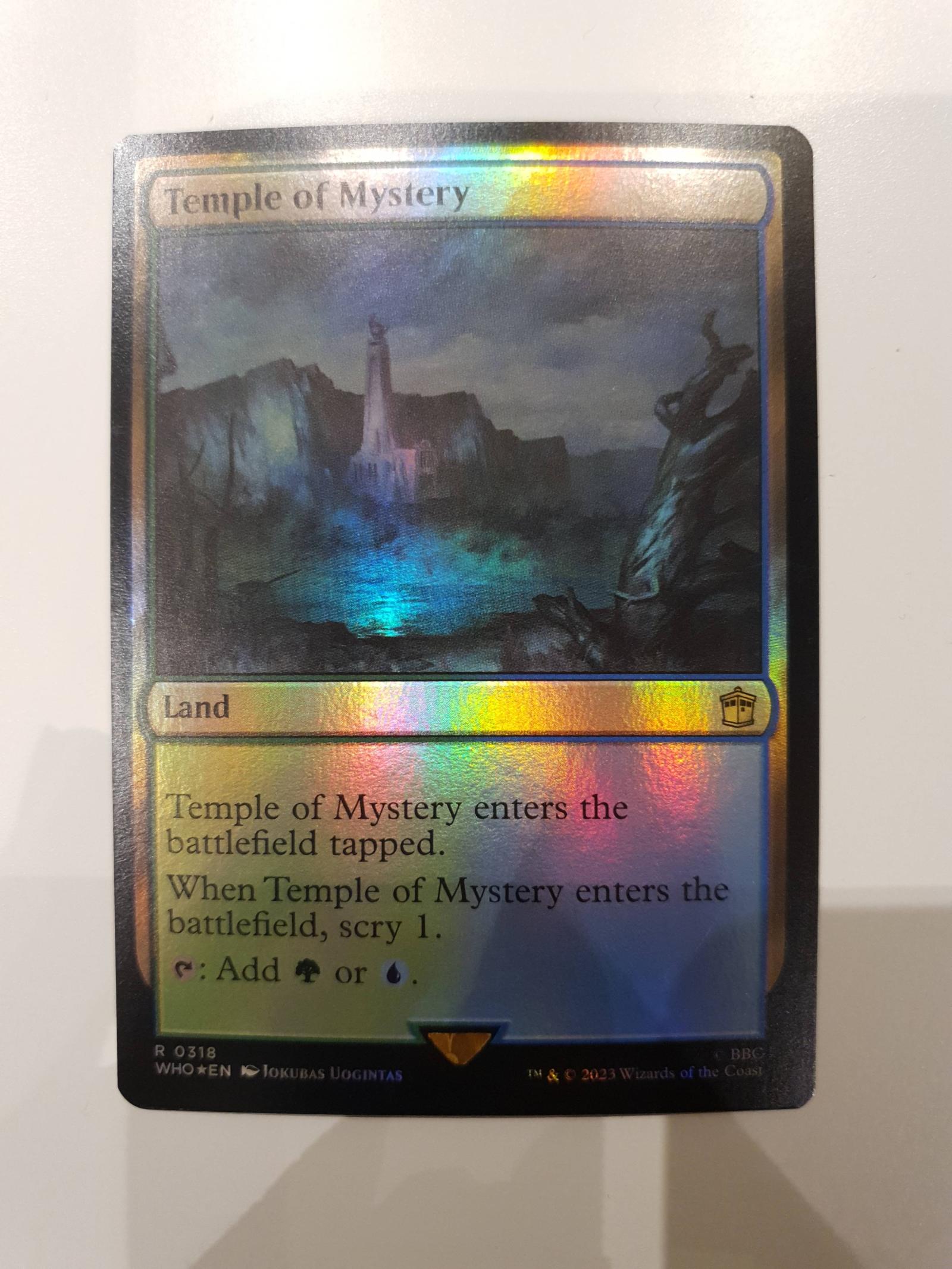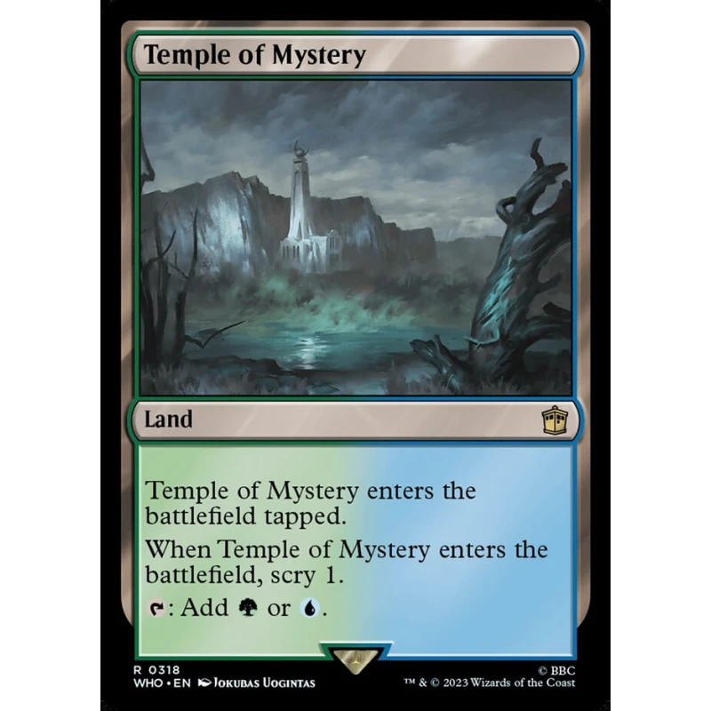 Temple of Mystery from the Double Masters 2022 set (WHO), illustrated by Jokubas Uogintas. This foil land card enters the battlefield tapped and allows you to scry 1, producing either green or blue mana. It is commonly used in multicolor decks and is both collectible and playable in various formats. The card has a collector number 318 and is printed in English.